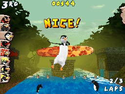 Ganz recht – statt euch wie in den Versionen für die großen Konsolen auf der Welle zu halten und Tricks einzustudieren, brettert ihr auf PSP und DS über eine platte Wasseroberfläche. Das nasse Element bewegt sich kaum und hat so gut wie keinen Einfluss auf eure Fahrt. Ab und an werdet ihr zwar am Bildrand oder hinter euch einen Brecher erspähen, doch der ist eher kosmetischer Natur. Die Entwickler hätten die Flüsse und die Uferpassagen genauso gut teerfarben kolorieren und als Rennstrecken verkaufen können. #TB_window {position: absolute;} ![]()