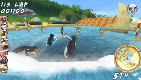Noch ein wenig lustiger wird es natürlich im Wireless-Modus, wenn ihr bis zu acht Freunden im gleichen Raum Beleidigungen an den Kopf schmeißen könnt. Auf dem DS braucht jeder Spieler ein Modul. PSP-Besitzer benötigen dank Game Sharing nur eine UMD, müssen aber auf den Online-Modus verzichten. Immerhin werden die Daten relativ schnell zu den anderen Konsolen übertragen. Im Solomodus fallen die Ladezeiten für UMD-Verhältnisse ebenfalls erfreulich kurz aus und werden sogar mit netten Filmchen unterlegt. Die einzelnen Charaktere bleiben nicht gesichtslos, denn sie werden allesamt vor den Rennen in unterhaltsamen Video-Clips vorgestellt. Auf dem DS müsst ihr leider auf einen Großteil der Zwischen-Sequenzen verzichten, wodurch eine Menge von der lockeren Atmosphäre verloren geht. Außerdem bekommt ihr auf dem Nintendo-Handheld nur kratziges Gitarren-Geschrabbel statt des launigen Surfpunk-Soundtracks der PSP-Version zu hören.