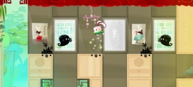 Hmmm, wären da nicht die markanten Ohren, wäre es gar nicht so einfach, diesen Block mit den zusammengekniffenen Augen, den roten Wangen und winzigen Gliedmaßen überhaupt als putzigen Hasen zu identifizieren – aber es muss ja auch nicht jedes Kampf-Karnickel so aussehen wie Jazz Jack Rabbit oder der blutrünstige Ash aus Hell Yeah. Zudem fügt sich der etwas unförmige Meister damit wunderbar in den etwas eigenwilligen Grafikstil ein, der sich am besten als eine Mischung aus Minimalismus und bunten Cartoon-Kulissen beschreiben lässt. Zu schade, dass man die farbenfrohen Schauplätze auch auf dem 3DS nur in 2D erleben darf: Selbst wenn man den Effekt am Schieberegler des Handhelds aktiviert, passiert nichts.
