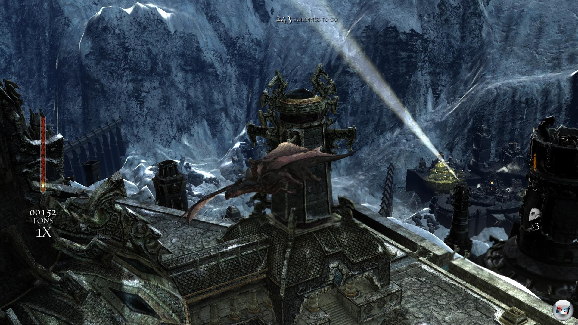 Hat man erstmal ein Ziel fixiert, das dann rot leuchtet, hat man mehrere Möglichkeiten: Wenn ich etwas im Visier habe, kann ich mich z.B. direkt wie ein Flugrammbock auf einen feindlichen Drachen stürzen. Oder ich speie Feuer aus der sicheren Distanz. Ersteres ist unheimlich effektiv, denn es führt zum sofortigen Tod des Gegners; Zweiteres sieht nicht mehr so klasse aus, ist aber ebenfalls nach zwei, drei Treffern tödlich. Besonders beeindruckend werden die Nahkämpfe inszeniert: Bevor es zum Austausch von Bissen und Hieben kommt, müsst ihr andere Echsen über Rammattacken in ein Gefecht