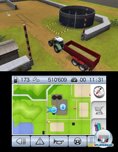 Weizen, Raps oder Mais gefüllt und lassen sich so auch schon bei Bahnhof, Mühle, Gasthof oder der Biogasanlage versilbern. Doch zunächst sollte ich mich meinen drei Startfeldern widmen, denn die wollen schließlich bewirtschaftet werden. Erstmals in der vier Jahre alten Geschichte der Serie stehen mir nämlich nicht sämtliche Felder der Spielwelt von Beginn an zur Verfügung, sondern müssen nach und nach für teures Geld erworben werden. Wie für die Serie üblich deuten kleine „I“–Symbole auf Informationsfelder hin, wo mir in kurzen Sätzen erklärt wird, was zu tun ist. So erfahre ich, dass zunächst auf Feld A der Weizen geerntet werden muss. Also fahre ich mit dem Mähdrescher an den Rand des Feldes, senke die Walze und lege los. Prompt leuchtet im Touchscreen-Display das Lenkrad-Symbol auf. Dies bedeutet dass ich mit einem Klick einen Helfer einstellen kann, der dann die Arbeit automatisch für mich erledigt und zwar schon jetzt gleich zu Anfang des Spiels – prima! Jetzt kann ich mich nämlich zeitgleich im Traktor den beiden anderen Feldern widmen. So kuppele ich den Grubber an und pflüge Feld B um. Hätte ich jetzt schon genug Geld für einen zweiten Traktor, könnte ich auch das einen Helfer erledigen lassen und währenddessen auf Feld C Aussaht betreiben. Nun denn: So weiß ich zumindest auf was ich sparen muss.