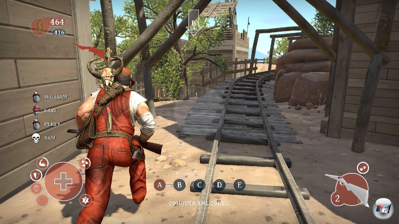 Es gibt übrigens auch einen Koop-Modus, in welchem sich zwei Spieler das Gold schnappen und eine immer größer werdenden Horde von Computer-Gegnern abwehren müssen. Die Bots sind allerdings mit derart wenig Intelligenz gesegnet, dass sie sich bereitwillig im freien Feld hinrichten lassen, wie von der Tarantel gestochen im Kreis laufen oder auf der Stelle hüpfen. Für mehr als ein paar Lacher ist diese Spielvariante also nicht zu gebrauchen. Schade auch, dass ich mich nicht einmal klassisch hinter einem Tresen oder Tisch abducken kann – stattdessen gibt es lediglich eine Ausweichrolle.