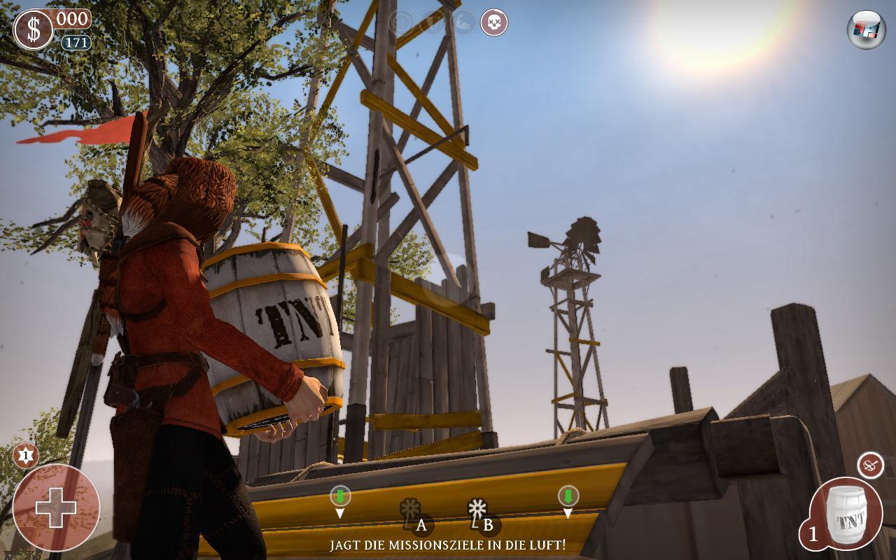 Auf der Haut der Charaktere glänzen sogar feine Härchen und Bartstoppeln. Die Frisur des Sprengmeisters erinnert dagegen an den Plastikkopf einer Playmobil-Figur. Wenn es heiß hergeht, torkeln die Cowboys auch gerne einmal mit albernen Ragdoll-Animationen durcheinander oder verbinden sich dank starker Schnittstellenfehler mit Zäunen und Hauswänden. Letztere lassen sich an manchen Stellen übrigens tatsächlich durchbrechen, wenn man ein Fass davor hievt und es mit einem Schuss in die Luft sprengt. Als Belohnung für’s Schleppen wandern Erfahrungspunkte aufs Konto und lassen den Level rapide in die Höhe schnellen, doch dazu später mehr. Nimmt ein Teammitglied die Spawn-Flagge aus der Basis mit, kann man übrigens direkt bei ihm im Getümmel wieder einsteigen.