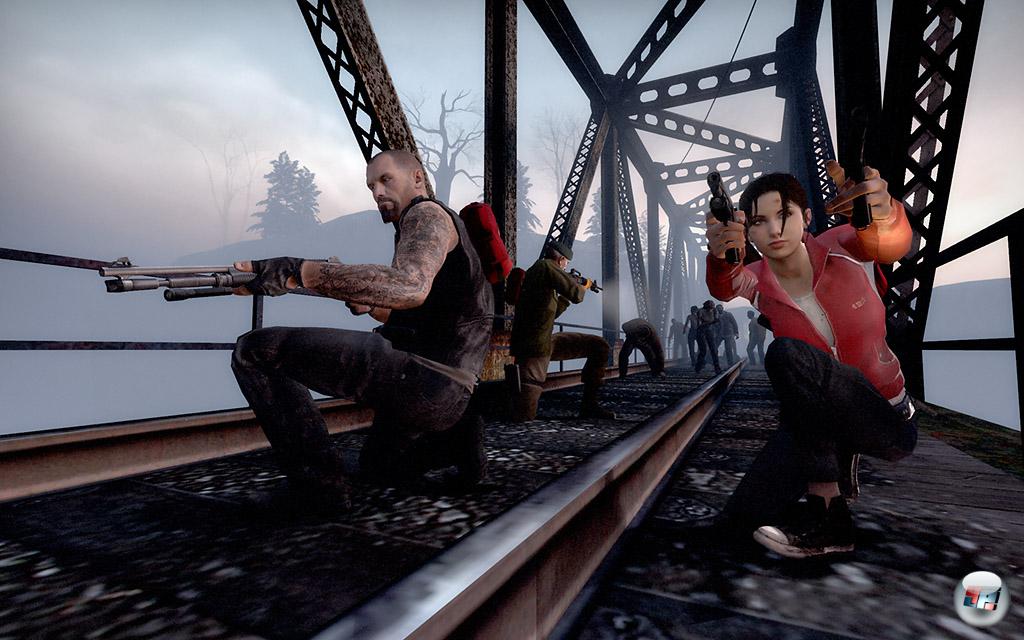 Zwei Wochen sind vergangen, als der erste Fall der Infektion auftauchte. Seitdem hat sich die Krankheit massiv ausgebreitet und unzählige Menschen in willenlose Zombies verwandelt, die ihren ewigen Hunger nach frischem Fleisch und Blut stillen wollen. Um diesem unschönen Schicksal zu entgehen, haben sich vier Überlebende gefunden, die gemeinsam versuchen, aus der Stadt zu fliehen und einen sicheren Zufluchtsort im Schutz der Army zu finden. Da wäre zum einen der Biker-Typ Francis – ein großer Kerl voller Tattoos, mit dem sich niemand gerne anlegen würde; außer einer Horde hirnloser Untoter. Und auch wenn die Lage äußerst bedrohlich ist, scheint es Francis doch sichtlich zu genießen, mit einer Pumpgun im Anschlag ordentlich aufzuräumen. Ähnlich sieht es auch der IT-Experte Louis, der dem Kampf ums Überleben durchaus etwas Cooles abgewinnen kann, wenn der eigene Körper mit Adrenalin vollgepumpt wird und Zombies durch die Gegend fliegen. Die größte Kampferfahrung hat jedoch Bill: Der Veteran war bereits im Vietnamkrieg im Einsatz, wurde mit Orden überhäuft und ehrenhaft aus der Armee entlassen. Dass er mit dem Alter noch nicht eingerostet ist, will er jetzt im Kampf gegen die Untoten unter Beweis stellen. Die letzte im Bunde ist die Studentin Zoey, die nicht nur aufgrund ihrer roten Jacke und ihrer Frisur samt Pferdeschwanz, sondern auch durch ihre Gesichtszüge eine gewisse Ähnlichkeit mit Claire Redfield aufweist. Ihr wisst nicht, wer das ist? Sechs, setzen! Die junge Dame ist die Schwester eines gewissen Chris Redfield und konnte bereits in diversen Resident Evil-Episoden Bekanntschaft mit Zombies und anderen gefährlichen Kreaturen machen. In Left 4 Dead ist die Story dagegen weniger komplex als in der berühmten Capcom-Serie: Hier gibt es keine Verschwörung, keine Experimente oder genaue Informationen darüber, wie das Virus überhaupt entstanden ist, das die Menschheit in die bestialischen