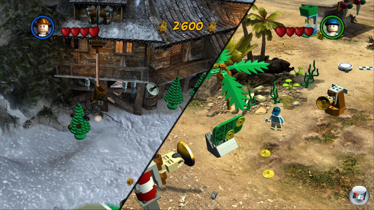 Technisch hat sich seit dem letzten Lego-Teil nicht viel getan: Nach wie vor sehen Landschaft und Figuren wunderbar verspielt und klotzig aus, die Animationen sind liebreizend, die gelegentlichen Zwischensequenzen sind teilweise zum Brüllen komisch und grandios animiert – mein persönlicher Favorit ist aber Indys Siegestanz, den er jedes Mal aufführt, wenn er ein Kapitel geschafft hat. Auf Xbox 360 und PS3 gibt es außerdem einen ansehnlichen Unschärfeeffekt, der im Vordergrund liegende Objekte realistisch verzerrt. Ansonsten sind die Fassungen optisch und spielerisch identisch, Letzteres gilt auch für die Wii-Version, die ausschließlich über die Wiimote/Nunchuk-Kombination gespielt werden darf. Ebenfalls allen Fassungen gemein ist die Möglichkeit, unter mehreren Sprachen zu wählen, wobei die deutsche Version einige interessante Stilblüten zu bieten hat – so wird aus »Motion Blur« z.B. ein philosophisch interessantes »Unklare Bewegung«.