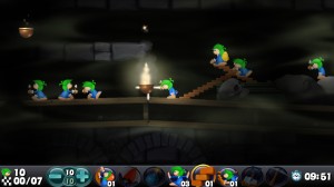Für ganz verzweifelte Fälle gibt es ein fünfstufiges Tutorial, in dem die acht Spezialfähigkeiten der Grünkoppblödel, von Buddeln bis Treppen bauen, unter die Lupe genommen werden. Sowie mit »Lichter«, »Teleporter« und »Klonmaschine« drei neue: Die Teleporter beamen Lemminge hin und her, die Klonmaschine erschafft einen zusätzlichen Suizidling. Und die Lichter, die die Wuschel mit sich herumschleppen, zünden kleine Feuerstellen an, die dunkle Levels ausleuchten. Außerdem gibt es auch frische Fallen wie den tödlichen Hackebeilritter. Und das sind noch lange nicht alle Neuigkeiten: Ist man es von klassischen Lemmings-Versionen gewohnt, dass man jeden Level mit allen verfügbaren Items beginnt, ist hier Umdenken angesagt. Denn Entwickler Team 17 hat sich von »All New World of Lemmings« inspirieren lassen, und präsentiert euch ein Item-System: Meist beginnt ihr mit einer oder zwei Eigenschaften, der benötigte Rest ist über den Level verteilt und wartet darauf, von euch aufgesammelt und eingesetzt zu werden – so arbeitet ihr euch Icon für Icon zum Ziel vor. Darüber hinaus gehen die Levels, sonst immer eher horizontal ausgerichtet, jetzt auch des Öfteren in Höhe und
