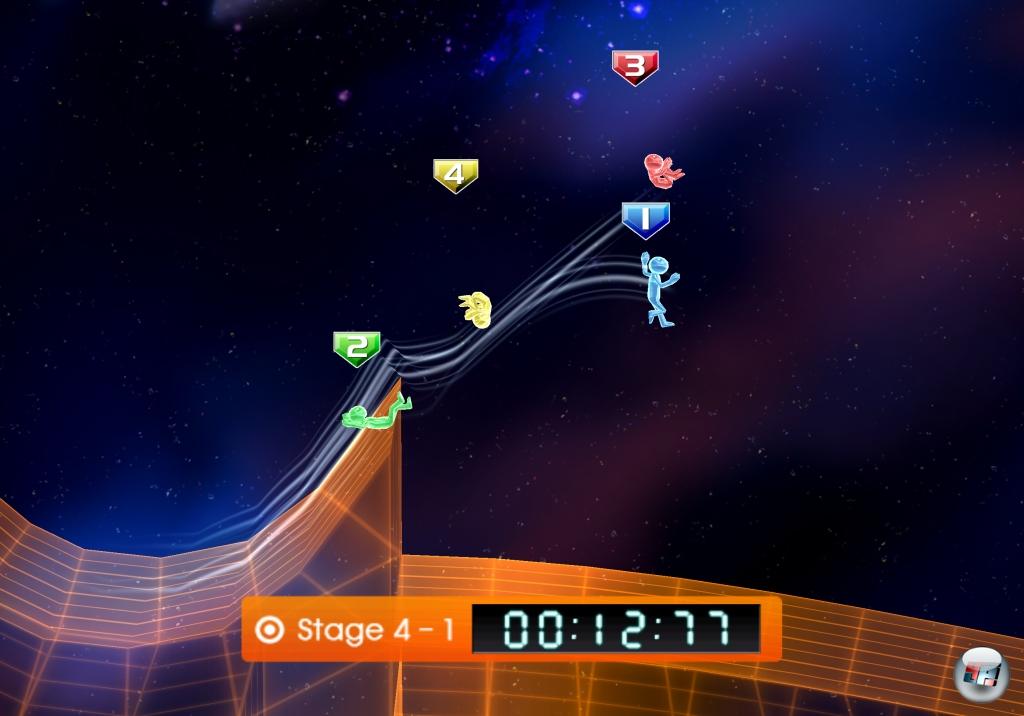 Immerhin: Das Quartett unterscheidet sich recht deutlich voneinander, so dass man seine Figur bei einem kniffligem Hürdenlauf von der Seite betrachtet, in einer Art Jenga ruhige Finger beweisen muss, zum Rhythmus der Musik tippt oder ein „Raumschiff“ an Asteroiden und anderen Hindernissen vorbei steuert. Im Bildschirmschoner starrt man hingegen in einen Fluss, während man durch unterschiedliche „Morsezeichen“ verschiedene Fische ins Bild ruft, lässt auf die gleiche Weise Feuerwerksfiguren explodieren oder kleckst durch unterschiedlich starkes Trommeln zufällige Farbstriche auf weißes Papier. Das schaut man sich mal an – dahin verklickt man sich anschließend aber nie wieder. Letzteres könnte höchstens durch Zufall passieren, weil das Spiel mal wieder die getätigte Eingabe (man kann sich wahlweise per Tap und Doppel-Tap durch’s Menü bewegen) nicht richtig erkennt…