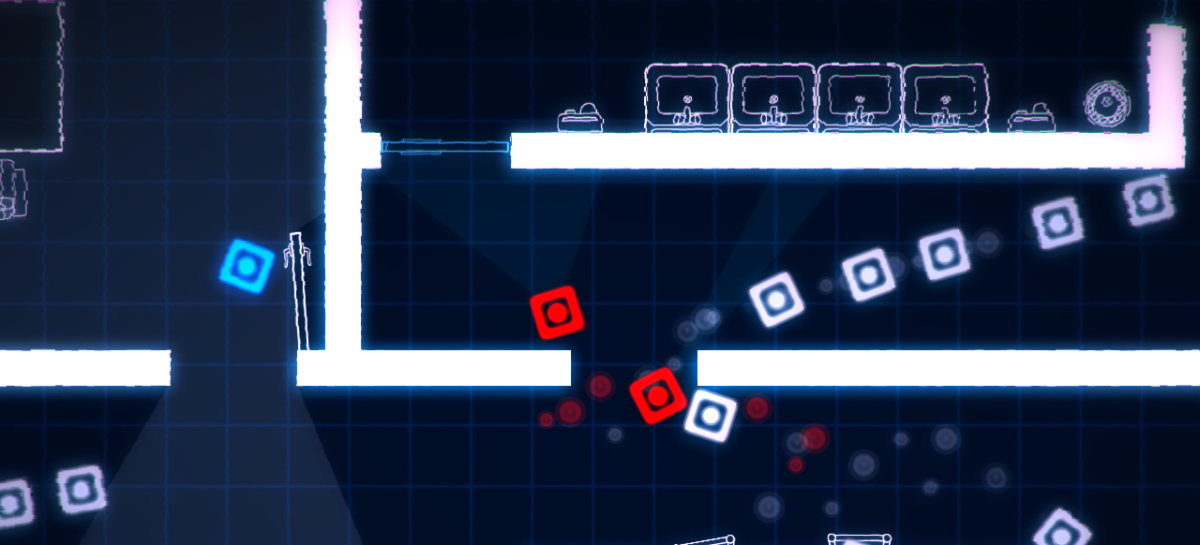 Zunächst leidet Max Schultz noch unter Gedächtnisverlust, doch bereits in den ersten Levels kommt er zumindest teilweise hinter das Geheimnis seines Gehirnimplantats. Das technische Gadget im Kopf kann offenbar nicht nur für ihn zum Verhängnis werden. Also beginnt er, in der streng bewachten Versuchseinrichtung nach Antworten zu suchen. Sonderlich originell wirkt die Geschichte natürlich nicht, als Cyberpunk-Fan hat sie mich aber trotzdem neugierig gemacht. Schade, dass die Entwickler die Erzählung durch das übertrieben minimale Design ausbremsen. Sämtliche Figuren werden lediglich durch farbige Quadrate visualisiert, was es mir sehr schwer machte, die in Textfenstern präsentierten Story-Schnipsel mit dem Spielablauf zu verbinden. Auch die schlichte KI sorgt nicht gerade dafür, dass die bunten Punkte in der Fantasie zu Menschen werden: Wachen grasen stumpf ihre Standard-Wege ab, harmlose Statisten lassen sich durch Räume schieben oder verkeilen sich auch mal vor einer Tür zu einem weiß leuchtenden Knäuel.