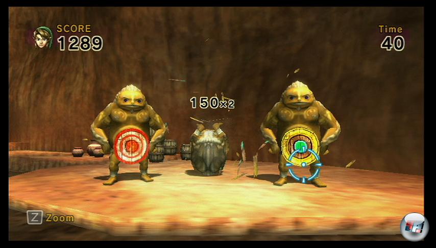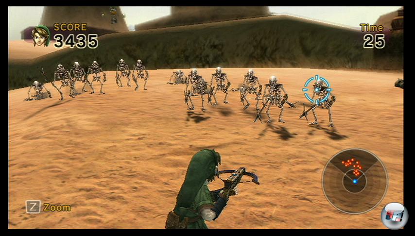 Und das Spielprinzip? Nintendo hat sich einiges einfallen lassen, um etwas mehr als geradliniges Bolzengeballer zu bieten. Es gibt Zeitlimits, falsche Ziele, die Punktabzug bringen, sowie versteckte Boni und Dauerfeuer-Upgrades. Wichtiger ist aber, dass das Kombosystem dafür sorgt, dass man wirklich gut zielen muss: Nur, wenn man einen Treffer nach dem anderen landet, erhöht sich der Multiplikator. Sprich: Trefft ihr dreizehn mal hintereinander ohne Fehlschuss, dann klingeln auf eurem Konto nicht 30, sondern 13×30 Punkte. Es gibt statische Levels, in denen sich nur Zielscheiben bewegen, einen Wasserfall hinunter stürzen oder plötzlich auftauchen sowie bewegte Levels, in denen ihr Link mit dem Analogstick durch Gemäuer oder Orklager schicken müsst – hier gilt es, alle Feinde zu finden und zu besiegen.