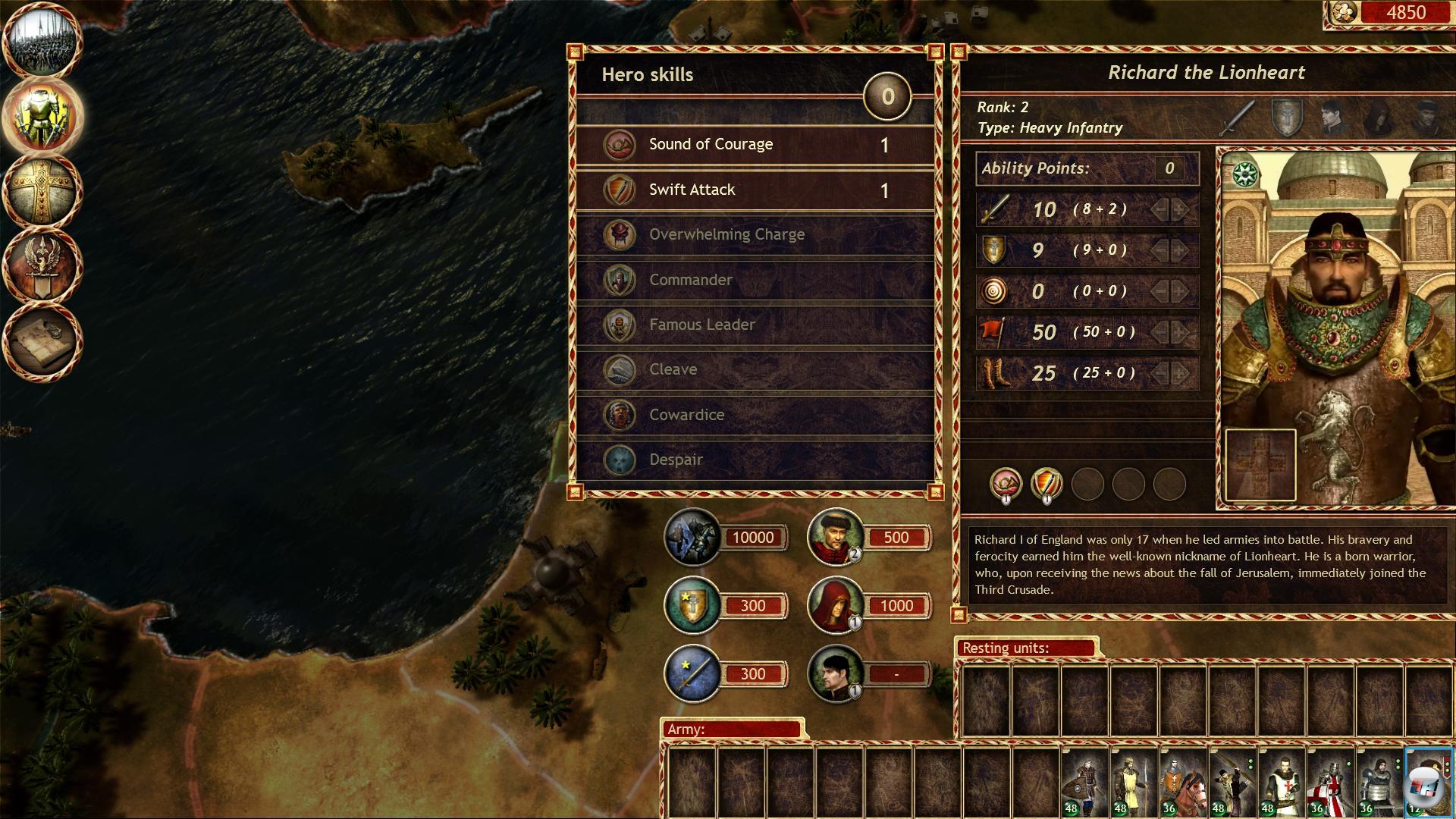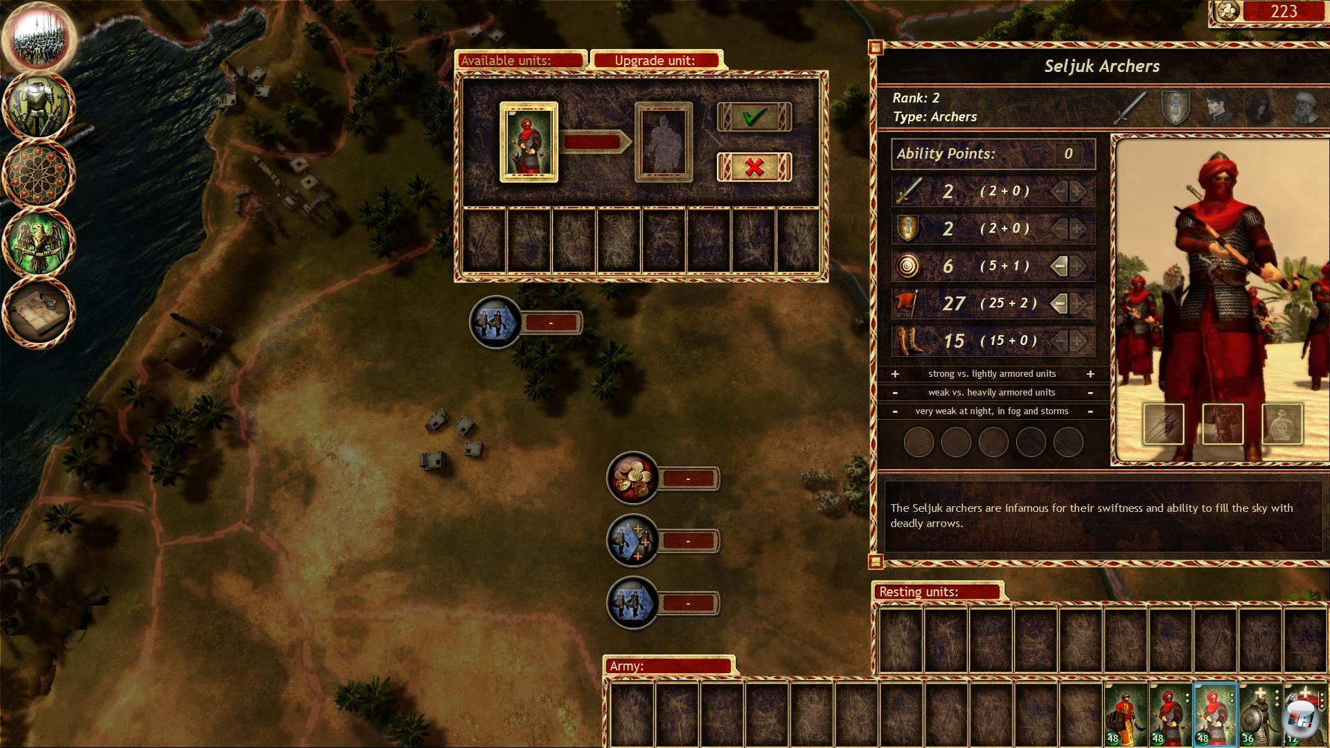 man zwischen zwei Missionen seine Armee aufrüsten, die in der Kampagne immer mitgenommen wird, wie man das seit Panzer General kennt. So kann man jeder Einheit ein Training verpassen, das etwa ihre Werte in Verteidigung steigen lässt. Oder man kauft ihr einen Priester, der die Moral hebt. Hier lassen sich zudem neue Einheiten kaufen und alte aufwerten, so kann man dem armen Löwenherz endlich Pferde spendieren oder aus der leichten eine schwere Einheit machen kann. Allerdings ist auch hier die Auswahl begrenzt, so dass man schnell alles gesehen hat. Hobby-Generäle warten dann nur noch, dass neue Einheiten hinzukommen, was nur nach eroberten Gebieten passiert.