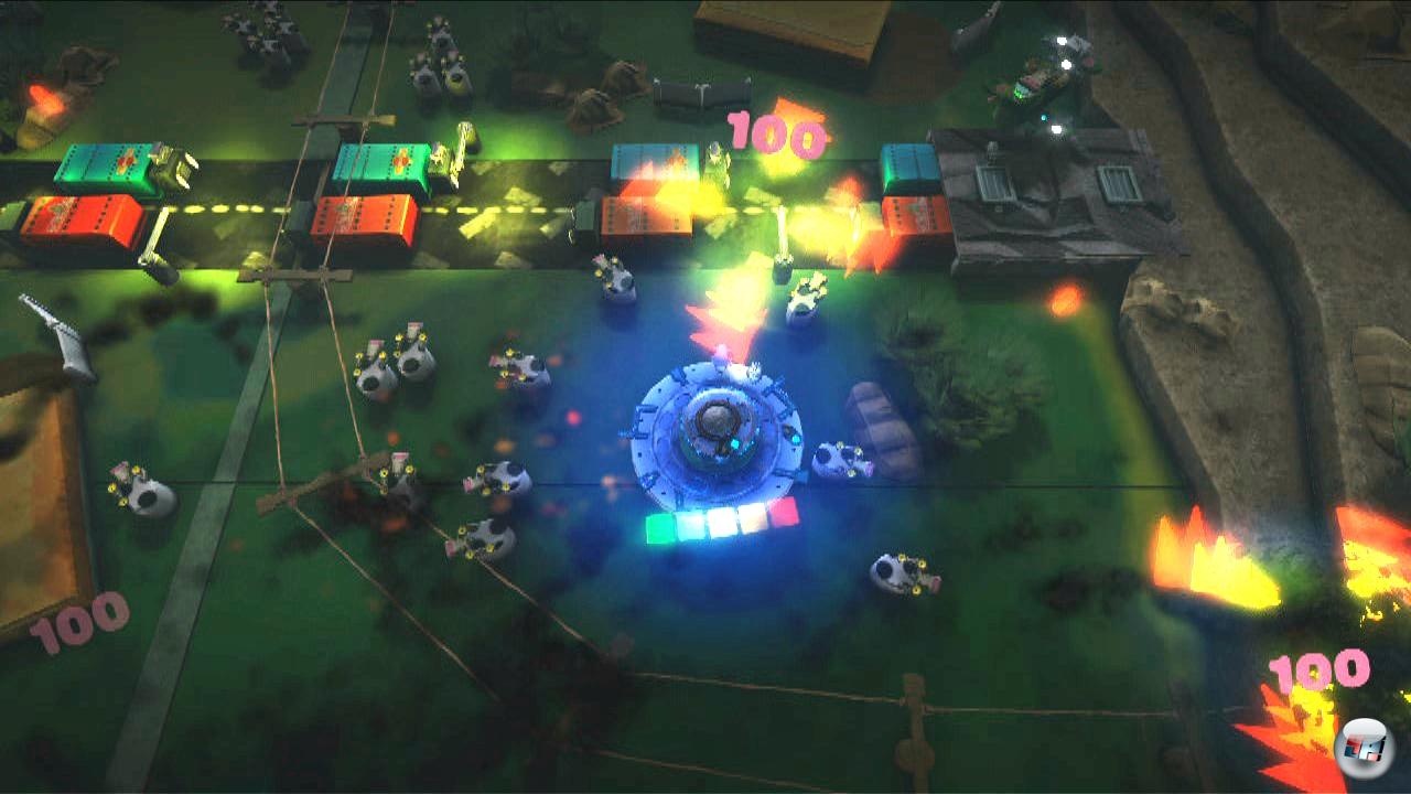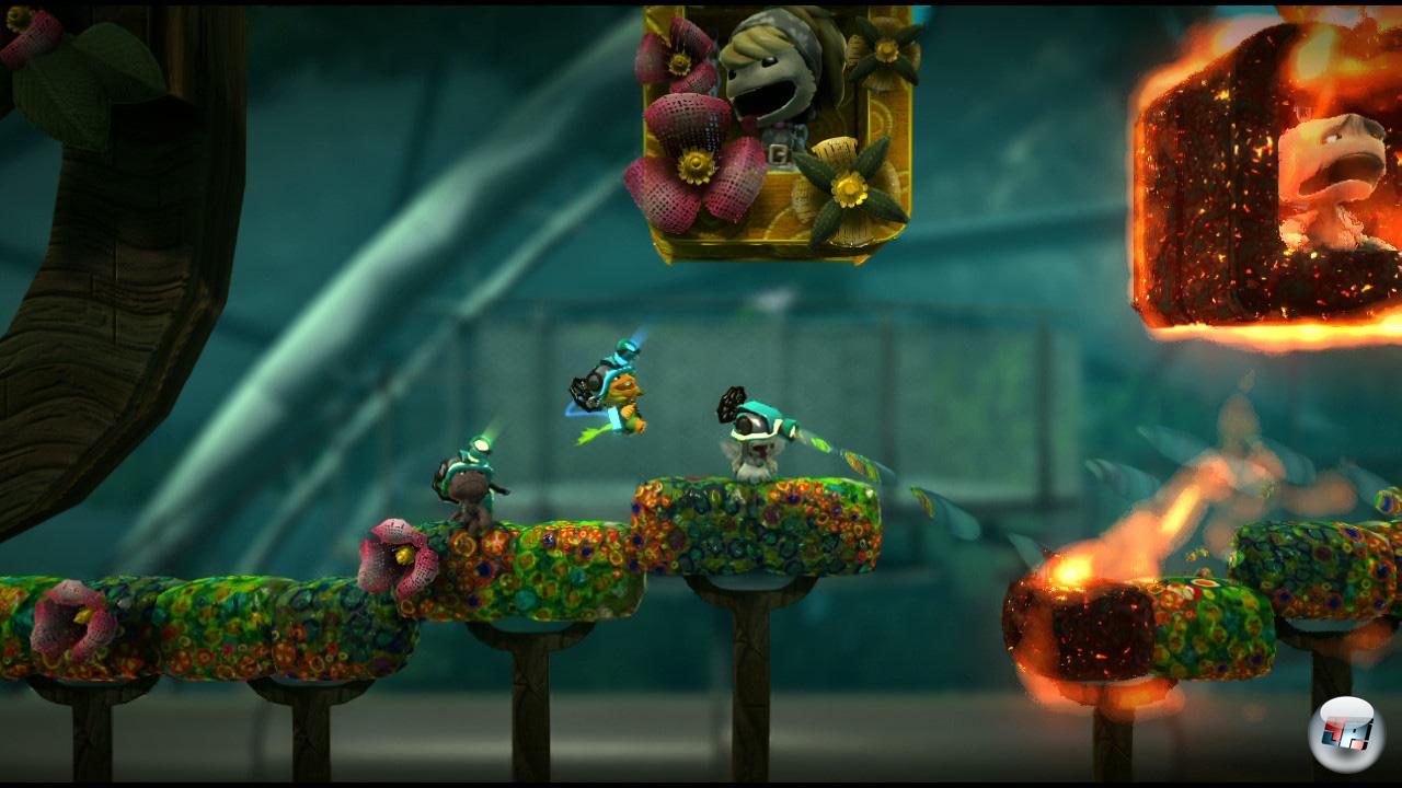 Eine weitere Neuerung sind die Sackbots: Je nach Programmierung laufen sie dem Helden treudoof hinterher oder ängstlich kreischend vor ihm davon. Ähnlich wie in Lemmings oder Mario vs. Donkey Kong: March of the Minis muss ich die putzigen Roboter sicher an allen Fallgruben und mechanischen Stampfern vorbei durch die Fabrik lotsen. Besonders viel Spaß macht es, wenn ich meine widerspenstigen Schützlinge in die Ecke treiben muss,
