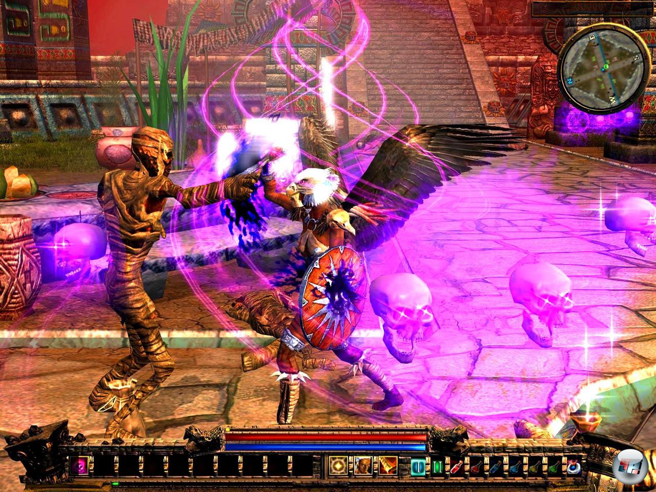 Nehmen wir z.B. die Story: Dank guter Sprecher für eure Auftraggeber und sämtliche missionsrelevanten Figuren wird die Mythenwelt zu stimmungsvollem Leben erweckt. Doch die erzählerischen Elemente an sich werden nicht so gewaltig transportiert, wie es der Göttermeuchelung entsprechen würde. Zudem ist die mit Kämpfen, Sammeln und Erforschen gefüllte Zeit zwischen diesen Sequenzen etwas zu lang, so dass man den roten Faden immer wieder verliert. Das ist höchst bedauerlich, denn vor allem im späteren Spielverlauf wartet die Geschichte mit einigen Überraschungen auf, die euch quer durch alle vier Mythologien hetzt.