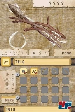 Viel interessanter wird es auf dem unteren Schirm, denn hier wechselt die Perspektive beim Sammeln, der Jagd oder beim Fischen in eine Egosicht, in der ihr den Speer mit dem Stift steuert und eure Stöße z.B. gut getimt ins Nass führen müsst – eine gute Idee. Auch das Ausgraben von Gemüse oder das Schütteln von Bäumen wird über den Touchscreen erledigt, so dass man immer aktiv ins Geschehen eingebunden wird und selbst Hand anlegen muss.