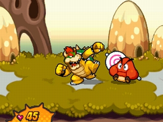 Die Kämpfe gehen auch dieses Mal teilweise über beide Bildschirme, allerdings anders als beim Vorgänger: Zuerst kämpft man auf dem oberen Screen mit Bowser, der kleinere Widersacher einsaugt. Dann erfolgt ein Zoom auf seinen Bauch zu den beiden Brüdern, die sich in seinem Innern tummeln – und dort für ihn die gerade verschluckten Feinde bekämpfen. Neu und wichtig ist auch die Art und Weise, mit der man jetzt Spezialattacken erhält: Statt diese einfach geschenkt zu bekommen, erfordern sie jetzt teilweise die Suche nach bunten Puzzleteilen. Hat man genug von einer bestimmten Sorte beisammen, wird der extra-starke Angriff freigeschaltet. Keine Sorge, das artet nicht in blöde Sucharbeit aus – die Teile sind grundsätzlich auf einem recht überschaubaren Gebiet verteilt, das Aufsammeln aller benötigten Stücke ist normalerweise ein Klacks. Sind alle Gegner besiegt, geht es an die Erfolgsauswertung: Für jeden gemeisterten Kampf erhalten alle beteiligten Parteien Erfahrungspunkte, die in unregelmäßigen Abständen zu steigenden Rängen führen – die wiederum bringen automatisch verteilte Punkte für zusätzliche Lebensenergie, stärkere Widerstandskraft oder höheren Schaden mit sich. Zum Abschluss der Ausschüttung darf man noch, Tradition ist Tradition, ein paar Extrapunkte in einer Art Mini-Roulette abstauben. Nettes Detail am Rande: Der Levelaufstieg wird dieses Mal in Form der guten alten Levelendfahne visualisiert.