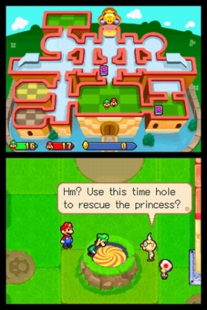 nette Effekte. Aber sonst? Komplett 2D, nichts, was der GBA nicht auch geschafft hätte. Aber wisst ihr was? Das ist vollkommen wurscht, denn das Gezeigte strotzt nur so vor Liebe und klitzekleiner cooler Details: Es gibt leuchtende, farbenfrohe, witzige und dieses Mal auch oft animierte Hintergründe. Die in einem eigenwilligen, fast schon skurrilen Comicstil designten Figuren und Gegner sind fabelhaft animiert, besonders Mario & Luigi bestechen durch eine wundervolle Mimik und Gestik. Der einzigartige Grafikstil, der etwas an Paper Mario, erinnert mag simpel sein, aber er ist jede Sekunde lang liebenswert! Und was noch viel besser ist: Das Spiel ist wundervoll bekloppt! Der Humor ist fast so brillant wie beim Vorgänger, die Mono- und Dialoge strotzen vor Wortwitz, das Spiel nimmt sich selbst und den Vorgänger keine Sekunde ernst: so wird z.B. von einem verschwörerisch tuenden Pilz das »große Mysterium« um die Bartpunkte gelöst; zusammen mit dem eindringlichen Hinweis, dass die wichtig seien und bitte nicht ignoriert werden sollten! Natürlich gibt es auch jede Menge Insiderwitze, so ist z.B. der Cameo-Auftritt von Krankfried ein köstliches Highlight.