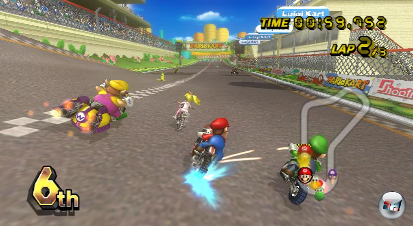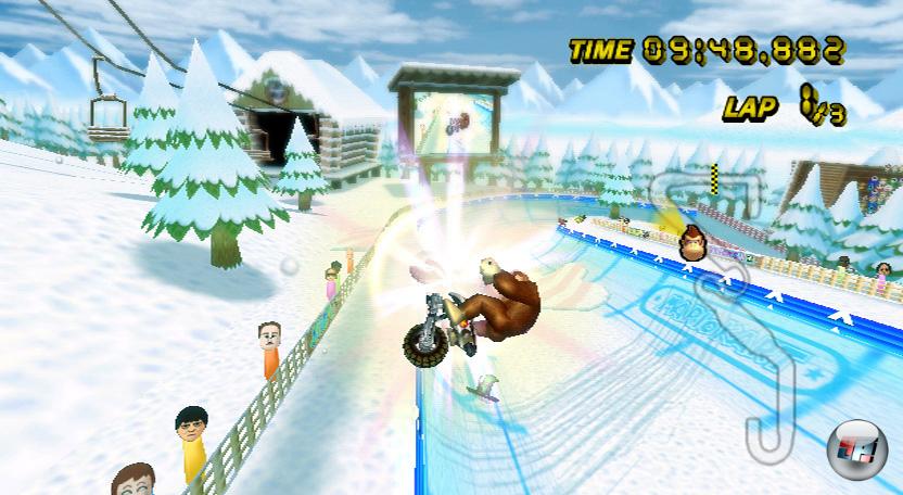 Die kleinen Kisten, von denen es ebenfalls pro Nase vier gibt, steuern sich herrlich flüssig – und natürlich unterscheiden auch sie sich stark voneinander. Viel wichtiger ist allerdings, dass die Bikes im Gegensatz zu den Karts nur einen Boost-Level haben. Dieser Nachteil wird allerdings dadurch kompensiert, dass man mit ihnen jederzeit Wheelies machen kann, die aufgrund ihres leichten Geschwindigkeitsschubes speziell auf Geraden über Sieg oder Niederlage entscheiden können. Aber natürlich sind sie kein Allheilmittel, denn durch die Wheelies wird die Steuerung erheblich träger, Lenken könnt ihr in diesem kurzen Zeitraum (der sich jederzeit abbrechen lässt) kaum noch. Außerdem verliert ihr bei Kollisionen mit Hindernissen oder anderen Fahrern mehr Zeit als üblich –