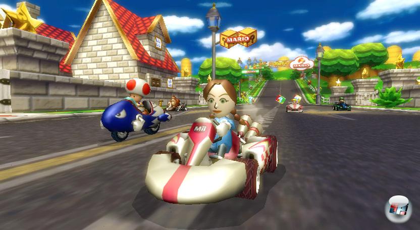 Drei frische Items verbreiten Furcht und Schrecken: Der »Pow-Block«, der nach einem kurzen Countdown die Erde erschüttert. Der »Maxi-Pilz«, der ganz wie in New Super Mario Bros. aus dem Fahrer für kurze Zeit einen alles niederwalzenden Giganten macht. Und der niederträchtige »Wolkenblitz«, die eine Zeit lang über dem Kopf des Opfers bratzelt, um es schließlich zu verkleinern – es sei denn, man rammt zwischendurch einen anderen Fahrer, dann wird die Seuche in »Du bist’s!«-Tradition einfach weitergereicht. Neuerdings sind auch zwölf Fahrer auf dem Feld statt der bislang üblichen acht, die ihr auch besser im Überblick behalten könnt, dem neuen Blick nach hinten sei Dank. Den braucht ihr allerdings nicht mal, wenn ihr ein gutes Surround-System im Haus habt: Alle Fahrer und alle Items haben einen klar erkenn- und unterscheidbaren Sound, den man schon aus einiger Entfernung zu hören bekommt und sich entsprechend auf die kommende Gefahr einstellen kann. Wer auf Raumklang verzichten muss, für den gibt es eingeblendete Icons und Kopfbewegungen des Fahrers, die einen ähnlichen Job erledigen. So oder so wird die Kart-Action von bewährt sehr guter Musik begleitet, ebenfalls eine Mischung aus bekannten und neuen Rhythmen – wobei es mir die irisch angehauchten Weise in der »Pilz-Schlucht« besonders angetan haben. Dazu gibt es den üblichen Mischmasch aus putzigen Stimmchen, Rasenmäher-Motoren und knuddeligen Soundeffekten.