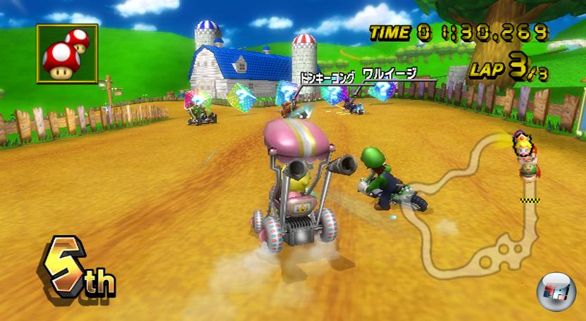 die zum Driften dient, ist perfekt platziert. Die Abfrage erfolgt präzise und ohne spürbare Verzögerung, das Spielgefühl ist hervorragend. Und wer keine Lust auf Herumgerudere vor dem Fernseher hat, den stellt Nintendo vor die Qual der Wahl: Wiimote? Wiimote mit Nunchuck? Classic Controller? GameCube Controller? Ihr könnt alles nutzen. Und das Schöne daran: Alles funktioniert auch ganz wunderbar. Lediglich mit dem GameCube-Pad gibt es Schwierigkeiten beim Auslösen der Stunts, liegt das Digikreuz doch ein Stück unter dem Analogstick, was mehr Umgreifen als beim Classic Controller erfordert. Aber nichts, woran man sich nicht schnell gewöhnen würde. Keine Variante bietet unüberbrückbare Vor- oder Nachteile, wer trotzdem nach einer Ausrede suchen möchte, der wird froh sein, dass bei Online-Rennen eingeblendet wird, welcher Fahrer das Lenkrad verwendet und welcher nicht. Und gerade hier wird man noch froher darüber sein, dass Nintendo aufgrund des neuen Drift-Systems das gefürchtete »Snaking« unmöglich gemacht hat. Ihr wisst schon: Die Drift-Sprung-Kombination, mit der Profis mit einer Art Dauerturbo rasend schnell durch jeden Level flitzen konnten. Zwar erforderte diese Technik mehr als alles andere eine übermenschliche Portion Skill, versaute jedoch jedes Online-Match. Wollen doch mal sehen, wie lange es dauert, bis ein Pendant in Mario Kart Wii entdeckt wird.