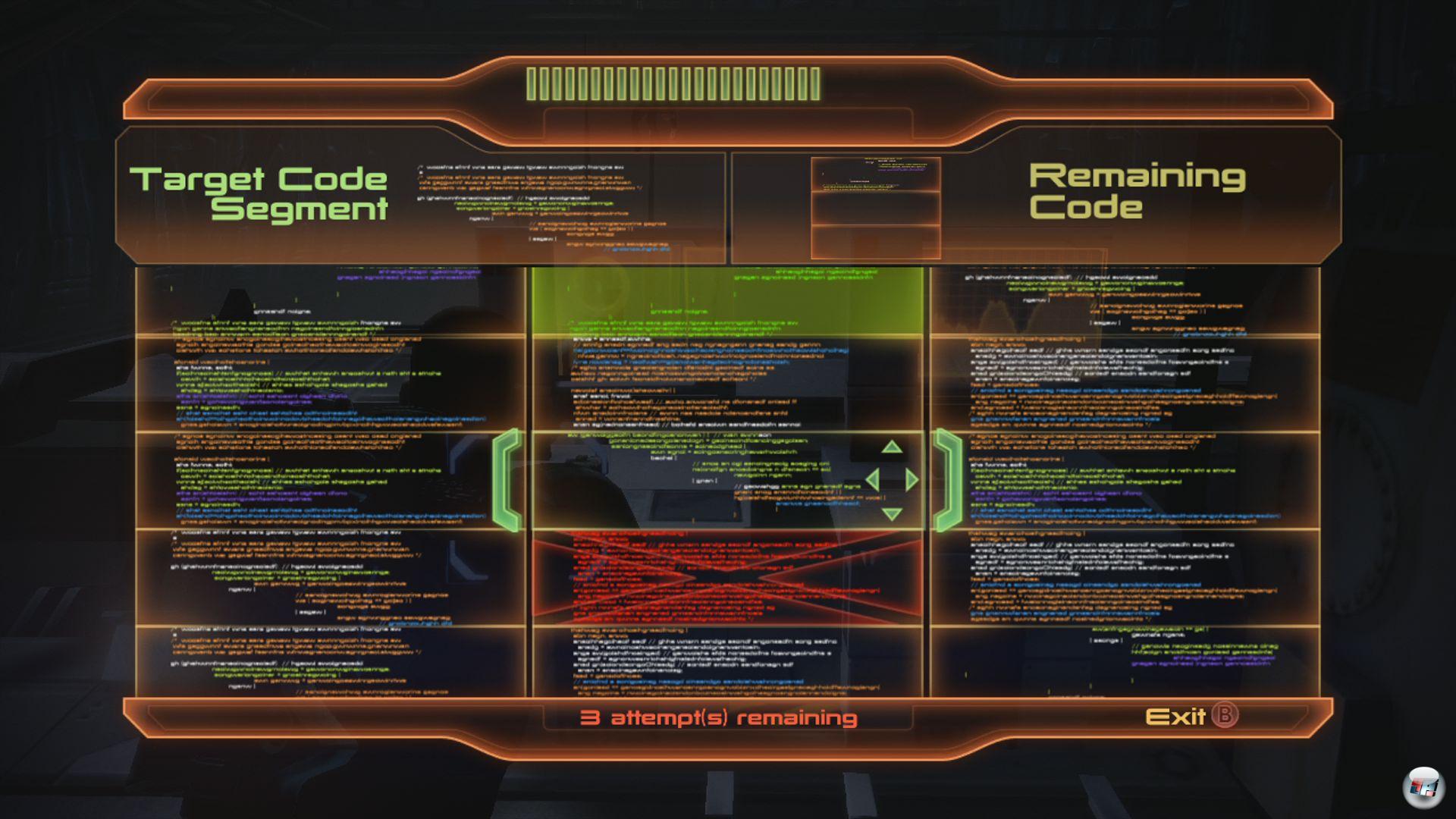 Immerhin gibt es noch ein zweites Minispiel. Zum anderen muss man nämlich drei Textfragmente in einem durchlaufenden Bereich voller Bruchstücke finden, wobei das gesuchte Stück jeweils oben angezeigt wird – das ist schon etwas kniffliger als das oben erwähnte Memory und hält auch länger bei Laune, da man hier auch mal scheitern kann, wenn man zu schnell navigiert und dabei auf ein verbotenes Fragment stößt. Aber auch hier versäumt BioWare die nötige Entwicklung: Warum wird dieses Prinzip nicht mal variiert, indem man z.B. fünf oder sieben Stücke finden muss und dann besonders belohnt wird? Man kann doch nicht über 35 Stunden zwei immer gleiche Minispiele anbieten, wenn diese bei nahezu jeder Tür-, Computer- oder Kisten-Öffnung zum Einsatz kommen.