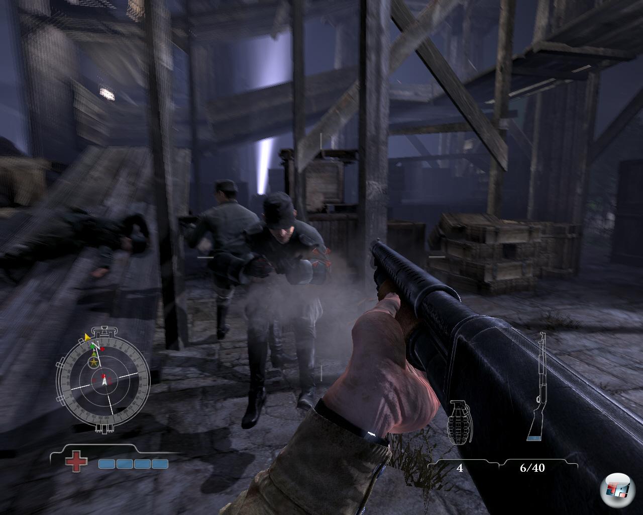 schwerer und landet direkt in der Nähe eines Wehrmachts-Trupps – keine sooo gute Idee. Zwischen diesen beiden Extremen liegen viele Möglichkeiten, die gerade mit dem nicht-linearen Missionsdesign, das dem Ansatz von MoH: European Assault <a class="DYNLINK" onmouseover="DynToolTipp_Show('Klicken für Gameinfos‚)“ onmouseout=“DynToolTipp_Hide(); “ href=“javascript:DynCont_Display(‚Gamefinder‘,’runmod.php?sid=%7BSID%7D&LAYOUT=dyncont_gf&spielid=7032′)“> folgt, eine gewisse Freiheit vorgaukeln. Schließlich könnt ihr euch selbst aussuchen, in welcher Reihenfolge ihr die Aufträge erledigt. Aber, und hier kommt das »Vorgaukeln« ins Spiel: Alle -müssen- erfüllt werden, damit’s weitergeht – die Freiheit ist also keine. Nichtsdestotrotz gehören die gefürchteten Levelschläuche früherer Einsätze der Vergangenheit an: In Airborne führen tatsächlich viele Wege zum Ziel; wenn’s irgendwo mal zu heiß hergeht, gibt es immer mindestens eine weitere Möglichkeit, an diese Stelle zu gelangen oder den Feind zu flankieren. Dieser taktische Ansatz tut dem Spielprinzip sehr gut, verlangt er doch ein etwas vorsichtigeres Vorgehen – was ohnehin das Credo von Boyd Travers, so der Name eures Protagonisten, sein sollte, denn die Feinde schießen schnell. Vielleicht sogar etwas zu schnell, um sonstige KI-Mängel auszugleichen. Nichtsdesotrotz finden sich Rambos sehr flott und sehr oft auf dem Boden wieder, die dreckigen, leblosen Finger von Travers vor Augen, bevor das Bild schwarz wird.