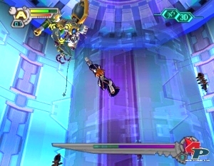 Leider brachte der Sprung in die dritte Dimension auch eine verschlechtere Steuerung mit sich: Die Reaktionen eurer Spielfigur sind schwammig und nicht immer präzise. Außerdem ist gerade bei Axl das Hover-Feature gründlich in die Hose gegangen. Ihr könnt nämlich nicht hovern und gleichzeitig feuern: Wenn ihr aus dem Ballern heraus abspringt, könnt ihr nicht schweben, da das Programm das Gedrückthalten der Taste nicht annimmt. Umgekehrt geht’s auch nicht: Wenn ihr aus dem Hovern heraus feuert, fallt ihr sofort aus allen Wolken – sehr umständlich. In