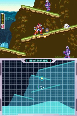 Wie der Name schon vermuten lässt, ist ZX eine Mischung aus den bisherigen X- und Zero-Games – und damit eine konsequente Fortsetzung der GBA-Jump-n-Runs. Allerdings gibt es eine wesentliche Design-Neuerung: Offene Levels! Mit einem Kopfnicken in Richtung Castlevania oder Metroid bietet euch ZX keine in sich geschlossenen Levels, sondern eine große Welt, die ihr theoretisch bereisen dürft, wie ihr lustig seid. Praktisch jedoch wird der Entdeckergeist schnell gezähmt: Die meisten Bereiche dürfen erst mit bestimmten Schlüsselkarten oder Ausrüstungsgegenständen betreten werden – das macht das an sich nicht-lineare Spiel sehr linear. Denn um bestimmte Bereiche zu betreten, muss man einen klar abgesteckten Weg gehen – und ziemlich viel Zeit damit verbringen, diesen zu finden. Die im Pausenmenü versteckte Übersichtskarte ist da leider keine Hilfe, zeigt sie doch nur, wie die großen Spielbereiche miteinander verbunden sind, sonst nichts. Immerhin werden euch an bestimmten Stationen, an denen ihr euch schnell von Ort zu Ort beamen dürft, umständliche Laufwege erspart – an denen dürft ihr auch speichern und neue Missionen annehmen.