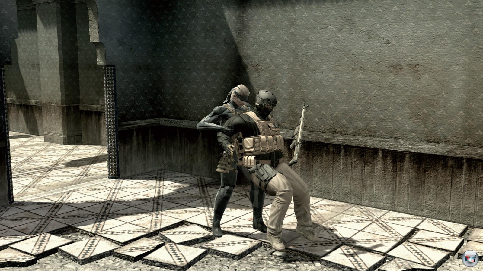 | CQC in Aktion: Ihr könnt Feinde elegant ausknocken, entwaffnen oder bedrohen, um sie dann nach Gegenständen zu untersuchen. |