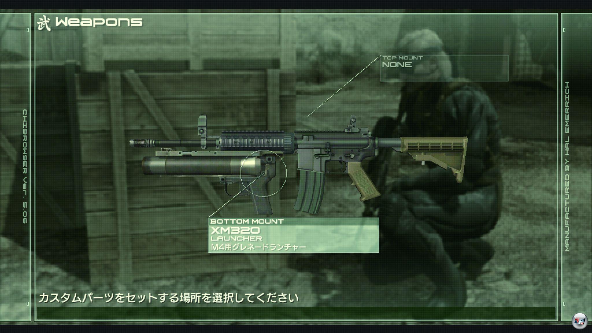 bei getöteten Gegnern findet und die sich schon in eurem Besitz befinden, landen automatisch beim Händler, der euch dafür im Gegenzug ebenfalls automatisch ein nettes Sümmchen überweist. Wollt ihr neue Waffen oder braucht Munition, müsst ihr nicht mal Drebin in den Kulissen aufsuchen so wie es beim Händler aus Resident Evil 4 der Fall war. Ein Druck auf die Start-Taste genügt und schon dürft ihr in einem Untermenü mit der Einkaufstour beginnen – später sogar mit Rabatt. Geht euch also in den Gefechten oder während eines Bosskampfes die Munition aus oder ihr wollt eine stärkere Waffe, steht euch mit dem entsprechenden Kleingeld nichts im Wege. Doch damit nicht genug: Genau wie bei Army of Two <a class="DYNLINK" onmouseover="DynToolTipp_Show('Klicken für Gameinfos‚)“ onmouseout=“DynToolTipp_Hide(); “ href=“javascript:DynCont_Display(‚Gamefinder‘,’runmod.php?sid=%7BSID%7D&LAYOUT=dyncont_gf&spielid=9841′)“> oder Rainbow Six: Vegas <a class="DYNLINK" onmouseover="DynToolTipp_Show('Klicken für Gameinfos‚)“ onmouseout=“DynToolTipp_Hide(); “ href=“javascript:DynCont_Display(‚Gamefinder‘,’runmod.php?sid=%7BSID%7D&LAYOUT=dyncont_gf&spielid=12931′)“> habt ihr auch hier die Möglichkeit, eure Pistolen, Maschinengewehre, Shotguns & Co nach eigenen Wünschen zu modifizieren. So klatscht ihr für mehr Durchschlagskraft einfach einen Granatwerfer ans MG, mindert mit einem Vordergriff den Rückstoß, montiert Laser- oder Punktvisiere oder schafft euch Schalldämpfer an, um weniger Aufmerksamkeit zu erregen. Wollt ihr nicht ständig mit Blendgranaten um euch werfen, dürft ihr sogar ein Blitzlicht ausstatten, um euer Gegenüber kurz außer Gefecht zu setzen. Daneben habt ihr auch Benzinbomben, Phosphor- und Rauchgranaten sowie Claymore-Minen, C4 oder Schlafgas-Behälter mit Fernauslöser im Sortiment. Viel Zeug also zum Rumspielen. Insgesamt dürfte MGS 4 eines der größten Waffensortimente überhaupt
