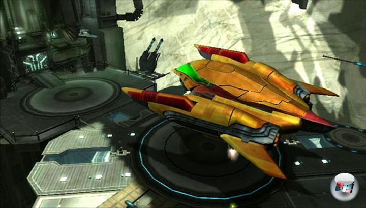 | Ein schnittiger Raumgleiter, der endlich aktiv zum Einsatz kommt: Samus kann ihr Schiff zu Landepositionen rufen, in das Cockpit steigen und sogar Hindernisse mit seinen Raketen aus dem Weg räumen. |