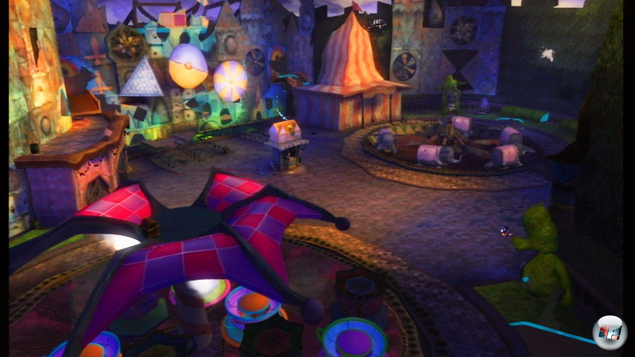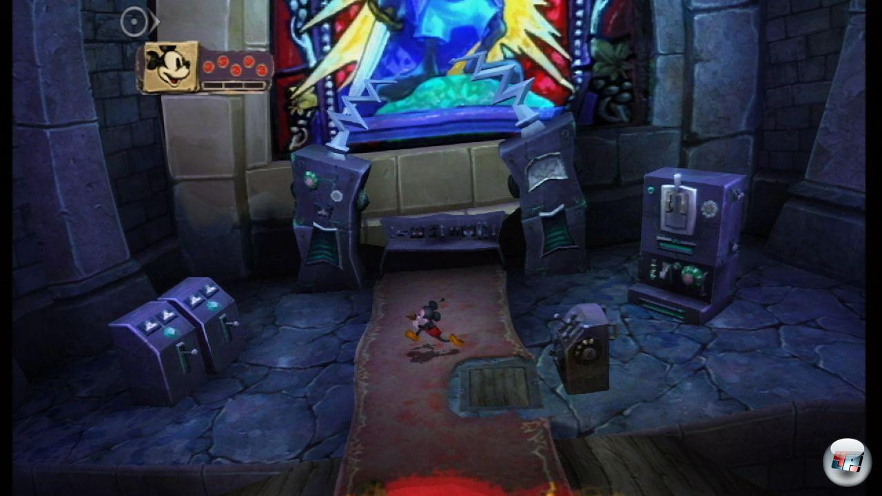 Und dann sind da die Übergänge, wenn Micky von einem Schauplatz zum nächsten reist: Springt die Maus in eine Leinwand, läuft und hüpft sie durch einen von der Seite gezeigten Abschnitt, in dem sie Geld und mit viel Geschick auch ein besonders wertvolles Extra findet. Jeder dieser Abschnitte wurde einem alten Disneyfilm gewidmet – Steamboat Willie etwa oder Fantasia. Für Erwachsene ist Micky Epic somit eine nostalgische Zeitreise; Kinder entdecken eine Welt, die ihnen mit Cars und Toy Story verborgen geblieben wäre.