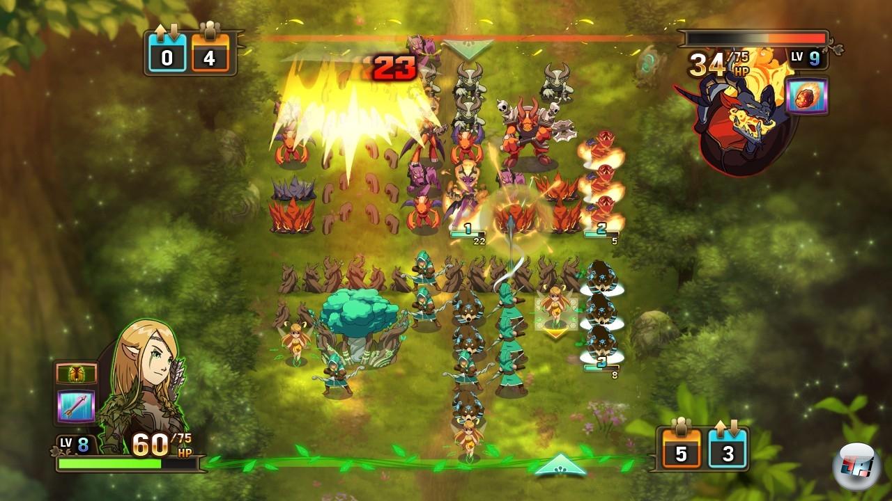 Alles dreht sich um clevere Dreier: Drei einfache Kreaturen gleicher Art hintereinander formen eine Angriffslinie, drei nebeneinander einen Verteidigungswall. Wer es schafft, die größten Wesen aufzuladen, indem man vier kleine derselben Farbe hinter ihnen platziert, ist auf einem guten Weg. Aber dabei bleibt es nicht: Man kann auch diese Gruppen nochmal aneinander binden bzw. sie fusionieren, wenn man sie parallel bzw. hintereinander formiert, so dass sie sich enorm verstärken. Je nach Volk gibt es noch ganz eigene Spezialmanöver – die Wurzelwälle der Elfen regenerieren sich, bei den Dämonen spucken Vulkanmauern Feuer. Und im Laufe der Kampagne schaltet man für alle Rassen weitere kleine, mittlere und große Kreaturen sowie Artefakte frei.