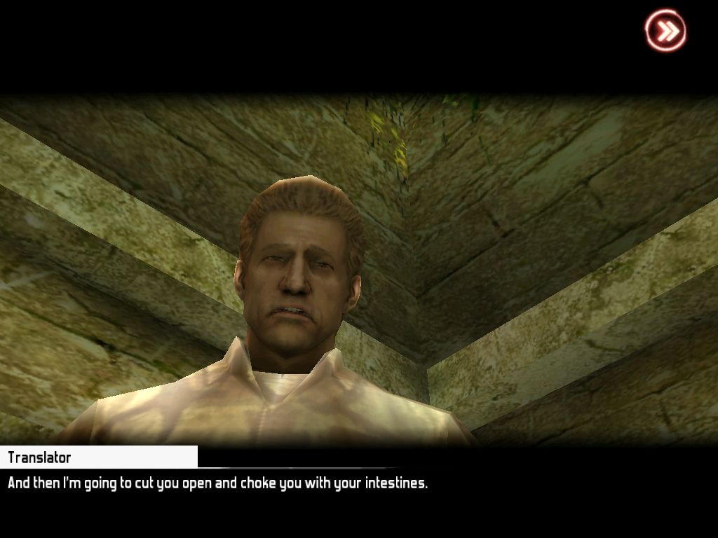 Als sich die Augen wieder öffnen, steht Pvt. Downs vor mir, der offensichtlich die beiden sadistischen Spaßvögel überwältigt hat und mir bei meiner Flucht hilft. Auch hier fällt sofort die für ein iPhone-Spiel ungewöhnlich professionelle englische Synchronisation auf (Deutsch sind nur Menü-Texte und Untertitel): Wenn ich mir beim Ausprobieren der Steuerung Zeit lasse, kommentiert mein Retter das prompt mit Sprüchen wie „Dir haben sie wohl besonders hart zugesetzt, was?“ Seine Lippen bewegen sich zwar nicht, trotzdem sorgen Szenen wie der gelungene Einstieg dafür, dass ich mich diesmal nicht wie in der nächsten öden gameloft-Schießbude fühlte.