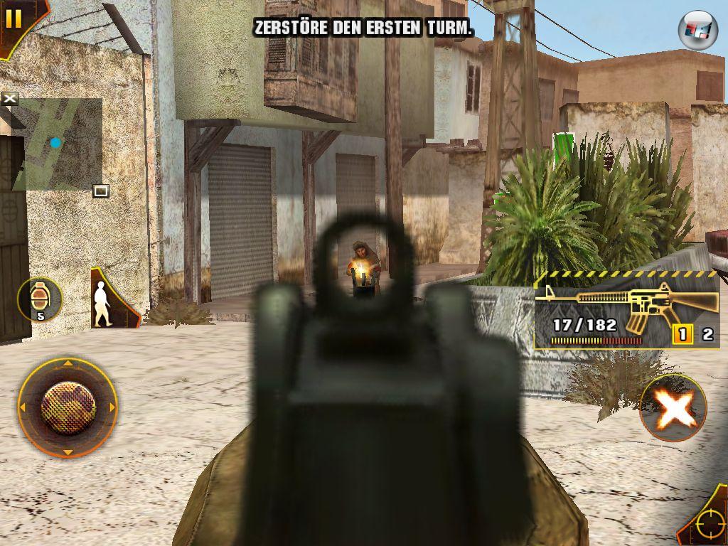 Die zehn Missionen führen zwar allesamt durch den staubigen nahen Osten, doch dort geht es z.B. inmitten einer Stadt, der Kanalisation, am Hafen, in einem Labor und in einem Krankenhaus zur Sache. Auf Steinplatten sieht man verwitterte Risse, Panzerfäuste aus angelaufenem Metall weisen erstaunlich feine Rillen auf und auf der Uniform des Protagonisten sind Schmutz und feine Nähte zu erkennen. Auf der Mission kommen zwei Sturmgewehre, ein Scharfschützengewehr, eine Bazooka, diverse Granaten und andere Bleispritzen zum Einsatz. Wie im Genre üblich, habe ich auch hier den Auftrag, Funktürme und diverse andere taktischen Ziele in die Luft zu jagen.