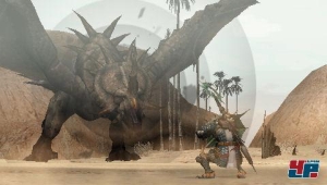 Aber welches Abenteuer erwartet den frisch gebackenen Monsterjäger eigentlich? Keins im herkömmlichen Sinne, da ihr weder Bösewichter plättet noch einer Handlung folgt. Ihr seid lediglich ein ganz normaler Typ, der sich wie schon auf PS2 im ungewöhnlichen Szenario seinen Lebensunterhalt verdient. Ungewöhnlich deshalb, weil Waffen, Rüstungen und euer Dorf zwar Erinnerungen ans Mittelalter wecken, das Geschehen aber in steinzeitlichen Dschungeln, Wüsten oder Sümpfen stattfindet – einschließlich Veloceraptoren und Flugsauriern. Capcom hat die wunderschönen Landschaften der PS2-Vorgänger ohne nennenswerte Abstriche auf dem Handheld zum Leben erweckt: Gleißende Sonne und wehender Sand über der weiten Wüste, ein hoher Blätterwald über felsigen Schluchten oder die fantastische Weitsicht ließen meine Augen immer wieder über die idyllische Umgebung schweifen. Die gellenden Schreie der Saurier oder das Knirschen beim Schleifen von Waffen klingen nicht weniger imposant. Nur wenn meine Heldin durch tote Dinosaurier hindurch läuft, holt mich die Technik in die Wirklichkeit zurück.