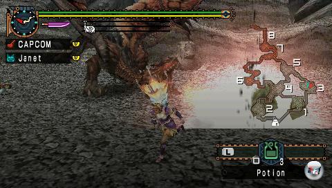 Und wieso muss man in einem Actionspiel immer und immer wieder dieselben spannungsarmen Sammel-Quests erledigen, um irgendwann genug Tierknochen beisammen zu haben, aus denen eine neue Waffe gebaut oder eine vorhandene aufgewertet werden soll? Auch in solchen Phasen wirkt die Missionsstruktur jeder natürlichen Dynamik entgegen. Ähnliches gilt für das Bepflanzen des eigenen Ackers, das Fischen oder das Schürfen von Mineralien. Nach jedem Einsatz erhält man auf diesem Weg wichtige Materialien für Tränke, Äxte, Fallen oder Waffen, mit denen man wiederum in den Aufträgen weitere Materialien schürft, fängt, ausgräbt oder jagt. Einige Aufgaben bestehen dabei aus dem einfachen Sammeln möglichst zahlreicher Vorkommen, die beim Abschluss in Punkte getauscht werden. Gegen diese Punkte darf man wiederum die Farm ausbauen oder Gegenstände kaufen, mit denen Waffen und Rüstungen verbessert werden. Unglücklich ist nur, dass manche Monster nach ihrem Ableben hinter der unsichtbaren Linie liegen bleiben, bei deren Überschreiten der Spieler in das angrenzende Areal geladen wird. Diese Ladezeiten fallen zwar dank einer optionalen Installation auf der Speicherkarte entschieden kürzer aus als bisher. Dass man gelegentlich nicht an die seltenen Materialien eines schwer zu besiegenden Dinos herankommt, ist allerdings frustrierend. Wäre es denn wirklich so schwer, die „Ladelinie“ im dritten PSP-Titel endlich undurchdringbar für die Monster zu machen?