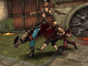 Der Gewaltfaktor gehört von Anfang an zu Mortal Kombat, natürlich ist Shaolin Monks da keine Ausnahme: Jeder Treffer lässt das Blut ordentlich spritzen, ihr könnt eure Feinde in Stacheln katapultieren, sie eine eiserne Jungfrau von innen besichtigen lassen, sie gefräßigen Bäumen als Snack servieren oder in eine gigantische Zermatsch-Maschine werfen. Ihr könnt (und müsst teilweise) die Umgebung samt der Gegner so in die Kämpfe einbeziehen, dass euch der Weg freigemacht wird – auch eine Art Puzzle.