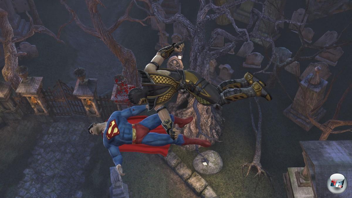 MKDC ist das erste HD-Mortal Kombat – und es macht seinen Job nicht schlecht: Die Figuren sind dem Plastiklook zum Trotz cool designt und animiert – mit Ausnahme der obligatorischen Baum fällt-Umfaller. Der Zucker für die Augen ist allerdings die Darstellung der Verletzungen: Schon nach ein paar gewechselten Fäusten zeigen die Kämpfer blutende Wunden, die Klamotten werden zerrissen, Masken zerfallen nach und nach, kassierte Feuerbälle hinterlassen Verbrennungsspuren – sehr schön! Die 14 Levels sind Szenarien aus den MK- und DC-Universen nachempfunden, und lassen euch in teilweise interaktiven Versionen der Bathöhle, dem zerstörten Metropolis oder Gotham City (mit Bat-Signal im Hintergrund) aufeinander eindreschen. Alles in allem zwar kein Vergleich zu grafischen Wunderwerken wie Soul Calibur 4 <a class="DYNLINK" onmouseover="DynToolTipp_Show('Klicken für Gameinfos‚)“ onmouseout=“DynToolTipp_Hide(); “ href=“javascript:DynCont_Display(‚Gamefinder‘,’runmod.php?sid=%7BSID%7D&LAYOUT=dyncont_gf&spielid=11928′)“>