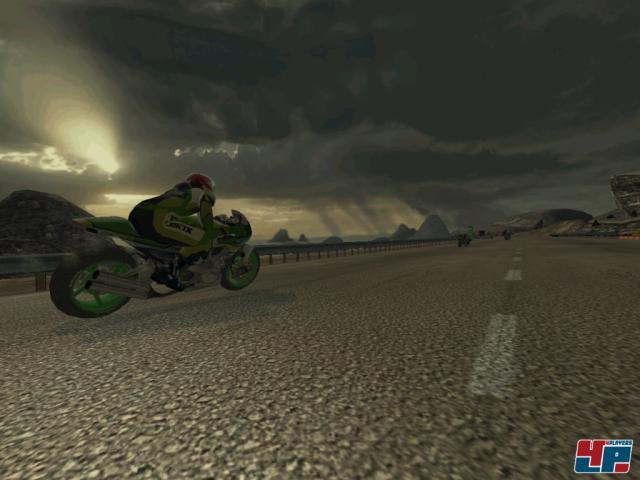 300 Sachen über die Piste geht, wird das Risiko damit nicht gemindert und es sollte eigentlich klar sein, dass man sich hier nicht als Rambo auf zwei Rädern durch’s Fahrerfeld kämpft. Ich weiß das und ihr wisst das vermutlich auch – nur die KI scheint davon noch nichts gehört zu haben und fährt euch – und damit auch die Hit-Auszeichnung – von hinten immer wieder gnadenlos über den Haufen. So kam es nicht nur einmal vor, dass die Rüpel mich in Führung liegend in der letzten Kurve noch abgeschossen haben – Frustration pur! Das alles wäre ja noch halb so wild, wenn sich die Rempel-Kerle bei einer Kollision ebenfalls hinlegen und damit die Konsequenzen ihrer rüden Attacken erleben würden. Leider passiert das nur in den seltensten Fällen, denn in der Regel fahren die Übeltäter einfach weiter – selbst das Fahrerfeld hinter euch brettert über euren Körper und die am Boden liegende Maschine hinweg. Wenigstens reißt es euch nicht alleine von der Maschine, wenn ihr mit hoher Geschwindigkeit direkt von hinten auf einen Gegner drauf knallt. Damit ist die Kollisionsabfrage in diesem Punkt zwar etwas besser als das Namco-Pendant, aber insgesamt noch sehr schwach und durch die unfairen Rempelattacken sogar noch frustrierender.