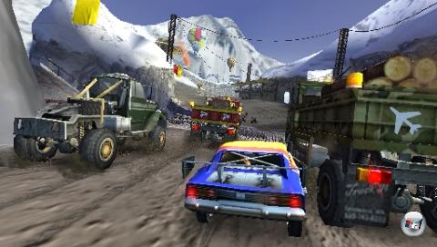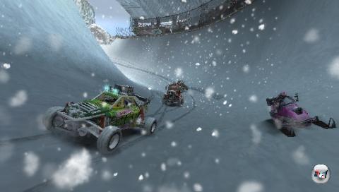 Wie die zwei PS3-Teile dreht sich auch dieser eisige Ableger um rabiate Offroad-Rennen über weitläufige Kurse. Die großzügige Streckenbreite hat ihren Grund: Die Fahrzeuge bieten zwar eine etwas gutmütigere Handhabung als in den PS3-Vorgängern, fahren aber immer noch relativ schwerfällig um die Kurven. Sogar in dieser verschneiten Kulisse muss ich schon ordentlich mit der Handbremse nachhelfen, damit mein Rallye-Auto ausbricht und um die Ecke schliddert. Dank der weiten Kurvenradien kann ich außerdem erfreulich ausgiebig Gebrauch von der Boost-Funktion machen. Lasse ich den Extra-Schub zu lange brennen, erinnert mich ein Zwitschergeräusch daran, dass mein Vehikel gleich in die Luft fliegt und ich schnellstens den X-Knopf loslassen sollte. Kalte Streckenabschnitte wie Wasserpfützen kühlen die Maschine wieder ein wenig ab.