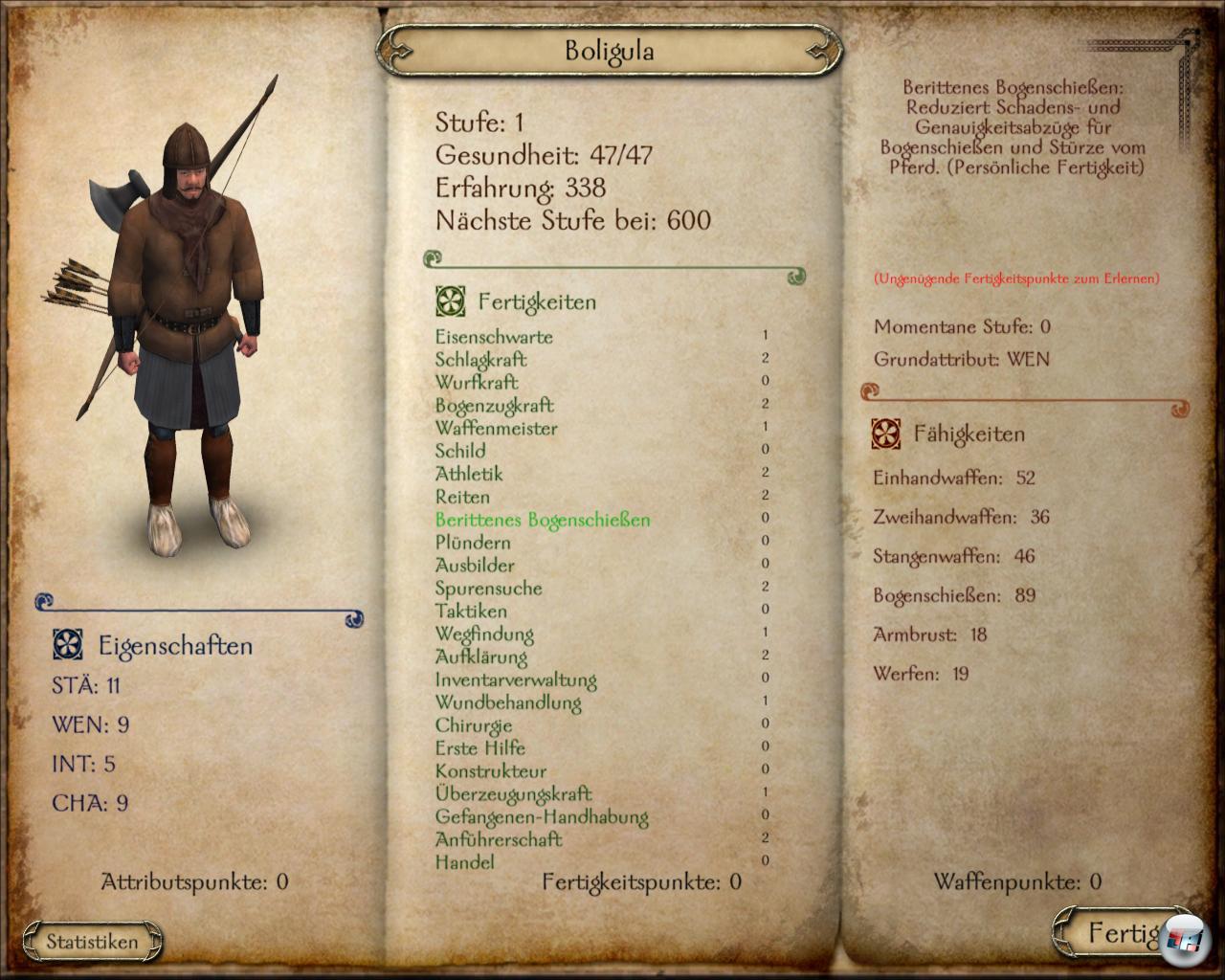 Alles fängt ganz klein damit an, dass ihr in einem recht friedlichen Fürstentum startet. Ein einzelner Mann mit Schindmäre, großen Ambitionen, billiger Ausrüstung und einem halbleeren Geldsäckel. Gleich zu Beginn bietet sich die Möglichkeit, eure Fähigkeiten im Kampf zu trainieren, was nicht schwer ist. Ihr könnt so ein paar Erfahrungspunkte extra erwerben und lernt über das voll spielbare Tutorial hinaus was übers Kämpfen. Besonders wichtig sind die Kampfestalente, die sich grob in Nah-, Fern-, Wurf- und Stangenwaffen wie Lanzen einteilen. Es wird immer das verbessert, was ihr auch einsetzt. Wenn ihr nie mit der Armbrust schießt, verbessert sich euer Wert auch nicht. Ihr könnt auch vom Pferderücken aus kämpfen, was ein Highlight des Spiels ist, insbesondere wenn ihr an einem Turnier teilnehmt.