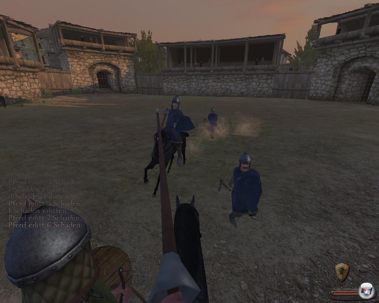 Perspektive zu sehen ist, als ob ihr wirklich mitreiten würdet. Leider führt ihr einen wilden Haufen, da ihr die Formation nicht festlegen könnt. Stattdessen gibt es nur fünf Befehle fürs Nötigste. Bewaffnet seid ihr mit Schwert, Lanze, Schild oder Bogen, was ihr per Maus wechseln könnt. Wahlweise könnt ihr auch absteigen und eure Fußkämpfer unterstützen. Ihr könnt die Axt schwingen, mit dem Speer stoßen und es gibt einen Aufprallschaden des Pferdes. Bei vollem Galopp mit dem Schlachtross kann das enorm sein, aber eigene Truppen könnt ihr zum Glück nicht verletzen.