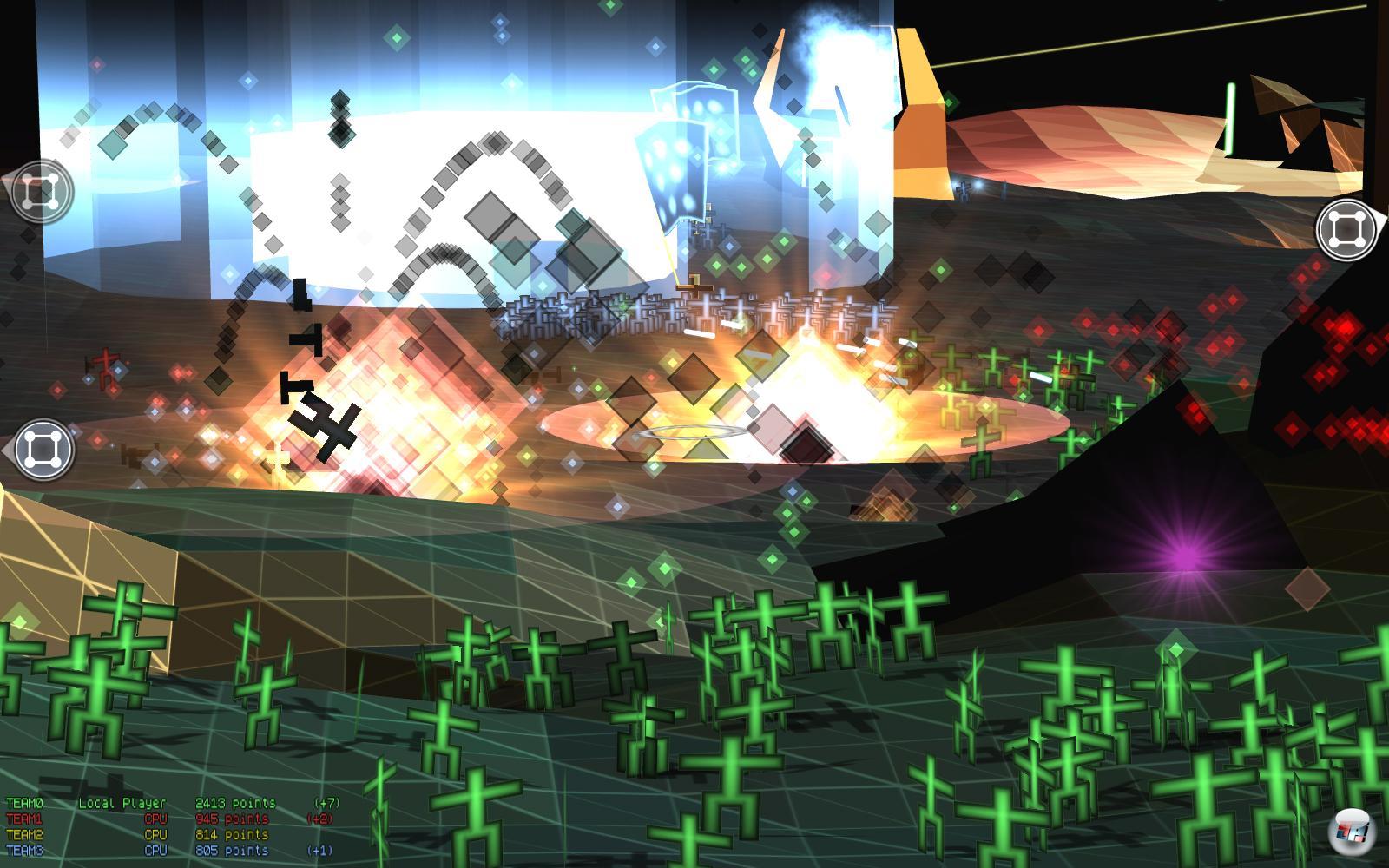 Da fallen nämlich in regelmäßigen Intervallen Kisten vom Himmel, und sobald eure Multiwinianer den Inhalt aufgelesen haben, dürft ihr die Extras einsetzen. U.a. gibt es Transporter, die bis zu 100 eurer Mannen schnell und sicher ans Ziel bringen sowie mit Soldaten besetzbare Geschütze und Flammenwerfer. Ihr erschafft außerdem Wälder, welche die Seelen feindlicher Krieger stehlen, macht eure Soldaten kurzzeitig unverwundbar, lasst sie besonders viel Schaden anrichten oder ihre Feinde zu Verbündeten konvertieren. Ihr könnt auch Meteoritenschauer auslösen, Atomwaffen abschießen oder einfach Napalm über den einfarbigen Strichgegnern abwerfen. Wer stets schnell genug Extras sammelt und für den richtigen Zeitpunkt aufhebt, erarbeitet sich wichtige Vorteile. So entstehen kleine Höhepunkte, die in dem strahlenden Retro-Lack zum Leben erweckt werden, der Darwinia so einzigartig machte.
