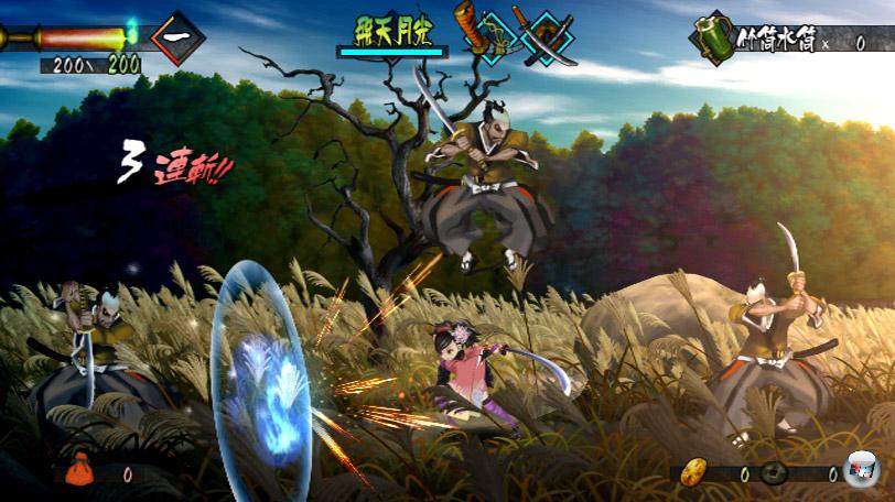 Muramasa ist kein besonders tiefschürfendes Spiel: Man trabt durch die wunderschönen, abwechslungsreichen Levels, bis ein dickes Ausrufezeichen ins Bild springt und das Weiterrennen unmöglich macht – es ist Kampfzeit! Aus allen Richtungen springen Ninjas, Geister-Samurai, schwebende Dämonen, Bombenschmeißer, Riesenfrösche oder merkwürdige Höhlenbewohner ins Bild, die Wesen für Wesen zerschnetzelt werden müssen – erst wenn die letzte Gegnerseele aufgesaugt wurde, darf es weiter gehen. Der Kampf gegen die meisten Widersacher gestaltet sich auch entsprechend einfach: Egal ob Wiimote/Nunchuck, Classic oder GameCube-Controller, es gibt immer nur einen Angriffsknopf, der in Kombination mit einigen wenigen Richtungsangaben unterschiedliche Manöver startet – theoretisch kann man Ausweichrollen, Kombos, Paraden oder Luftangriffe machen. Muss man aber nicht, denn die meisten Scharmützel sind durch reines Buttonmashing, das automatisch Kombos hervorruft, problemlos zu gewinnen – selbst auf dem höheren der beiden Schwierigkeitsgrade, wobei hier eine spezielle Spieleigenschaft stärker in den Vordergrund tritt: Die zerbrechenden Schwerter. Man hat immer drei Säbel dabei, die sich mit der Zeit abnutzen. Wenn man blockt oder Spezialangriffe einsetzt, wird die »Schwertseele« verringert; ist sie bei Null, bricht die Klinge – mit der kann man nicht mehr blocken oder Speziallattacken nutzen. Dann muss sie für kurze Zeit zurück in ihre Scheide, um sich automatisch zu reparieren – währenddessen greift man zu einer der beiden anderen, wobei der Wechsel der Klinge den Bildschirm wie eine Art Smartbomb kurz von Feinden reinigt.