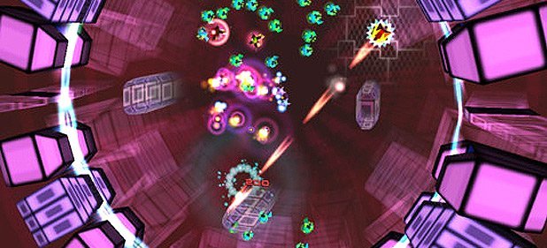 Für Zeit-Überschuss, übrig gelassene Bomben und andere Kleinigkeiten gibt es Bonuspunkte. Per Gamecenter-Bestenlisten darf man sich mit dem Rest der Welt vergleichen. Erstaunlich gut funktioniert die Steuerung: An zwei Analogknubbel kommt sie natürlich nicht ganz heran, trotzdem fühlte ich mich sofort wohl. Die Schuss- und Flugrichtung lässt sich feinfühlig vorgeben. Dazu sind nicht einmal virtuelle Sticks nötig. Stattdessen legt man beide Daumen bequem irgendwo links und rechts unten ab und bewegt die Kuppen behutsam zur Seite. Wer möchte, kann auch die Empfindlichkeit regeln oder zu einer Linkshänder-Konfiguration wechseln. Nach den 89 Levels des Abenteuermodus gibt es aber nur noch wenig zu tun. Der lokale Koop-Modus der XBLA-Version ist nicht dabei; stattdessen gibt es lediglich die Zeit-Attacke für einzelne Räume.