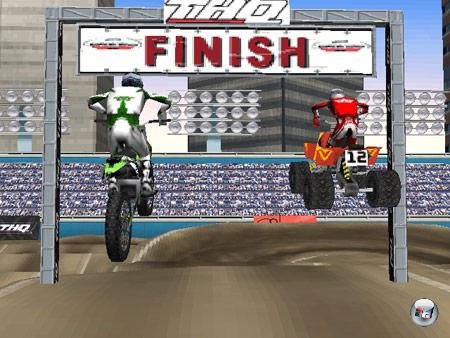 Augen steigen lassen. Denn die MX-Bikes und ATVs verschwinden auch noch regelmäßig durch fiese Clippingfehler in den mit Monsterpixeln ausgestatteten Texturen. Doch eines muss man der Engine lassen: Sie läuft durchweg flüssig und sorgt insgesamt für ein gutes Geschwindigkeitsgefühl, auch wenn ihr einzig in einer Außenansicht am Gaszug ziehen dürft. Dabei erweist sich die Steuerung allerdings als etwas schwammig und die ATVs lenken sich in den Kurven ungewöhnlich schwerfällig. Hebt ihr dann nach einem Sprung ab, habt ihr dagegen das Gefühl, als seien die Gefährte leicht wie eine Feder. Noch krasser sind allerdings die Flugeinlagen der Motorräder, nach denen ihr oft neben der Piste landet, weil die übertriebene „Flugphysik“ ganz und gar nicht zum Streckendesign passen will. Auch das Kollisionsverhalten in Zweikämpfen sorgt oft für ein großes Fragezeichen über eurem Kopf. Kein Wunder, dass ihr auch keine Einstellungen vornehmen oder Teile hinzukaufen könnt, um die Performance eures fahrbaren Untersatzes zu verbessern. Doch eines macht MX vs. ATV auf dem DS sogar besser als auf den Konsolen: Das Strafsystem ist längst nicht mehr so penibel und setzt euch schon nach einem kurzen Ausritt wieder hinten auf die Strecke zurück. Stattdessen dürft ihr hier ungehindert weiter rasen, wenn ihr relativ schnell wieder auf ![]()