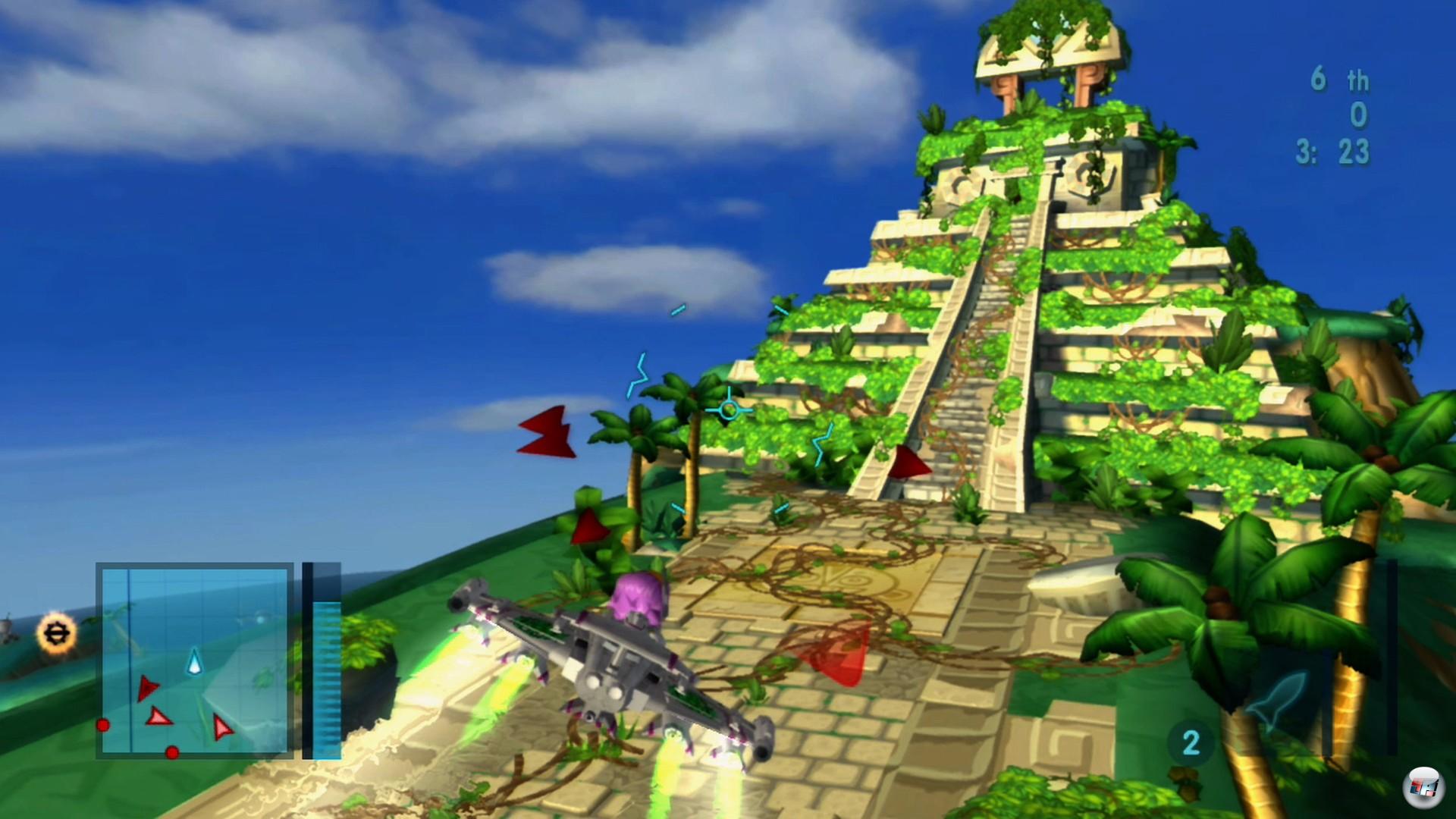eine Kleinigkeit, die beim Spielspaß keinerlei Wirkung zeigt, weil ansonsten alles identisch ist. Und weil man sich mit den Wii- und PS3-Versionen auch gewisse technische Probleme teilt: Dazu gehört z.B. eine zwar stimmungsvolle, aber nicht herausragende Comic-Kulisse mit klaren Strukturen und pastelligen Farben, deren Bildrate auf allen Systemen immer wieder in grenzwertige Bereiche abdriftet, ohne aber die Schwelle zur Unspielbarkeit zu überschreiten. Dennoch ist es schade, dass ein Titel, dessen Stärke ohnehin nicht in der visuellen Qualität liegt, hinsichtlich der Bildrate nicht mal gängige Standards erreichen kann – auch wenn das der angepeilten jüngeren Zielgruppe ziemlich egal sein dürfte. Doch den Eltern, die mit ihren Kids gemeinsam in die Luft gehen, werden die kleinen Ruckler immer wieder auffallen.![]()