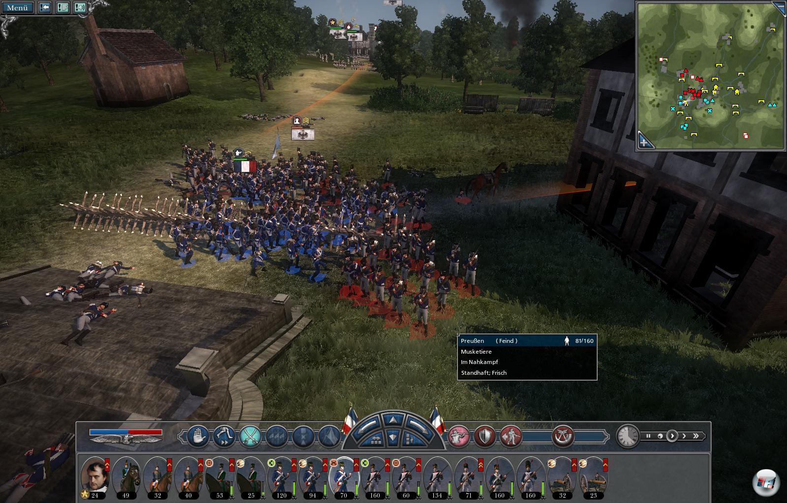 Und warum kann man mal ein mehrstöckiges Haus besetzen, aber dann wieder keine Kirche? Warum kann man überhaupt so wenige Gebäude in die Schlacht mit einbeziehen? Dass Napoleon die taktische Rolle der Siedlungen im Vergleich zum Gelände eher vernachlässigt hat, ist zwar durchaus korrekt. Aber er wusste um ihren Wert an Flanken und als Stellungsverstärkung – im Gegensatz zur KI im Spiel, die sie zu oft ungenutzt lässt. Schade ist auch, dass sich bei den Animationen im Siedlungsgefecht nichts getan hat: Man zieht seine Reihen per Maus in eine Position, aber die Soldaten nutzen nicht immer kontextsensitiv die Deckung von Mauern, Wänden oder Bäumen – hier würde man sich auch innerhalb einer Truppe ein flüssigeres Hinknien, an die Wand pressen und hinter den Baum hocken wünschen. Ein echter Nachfolger müsste authentischere und intelligentere Bewegungen anbieten. Die gibt es dafür innerhalb der offenen Schlacht: Es macht einfach Spaß, bei souverän wechselnder Schussreihe, panischem Moralverlust oder Reiterei im Keilangriff mitten rein zu zoomen und sich die Bewegungen anzuschauen – Kenner werden einige neue Animationen wie abgeworfene Reiter im tragischen Schlepptau ihrer Pferde entdecken, die das Schlachtfeldgefühl eindeutig bereichern.