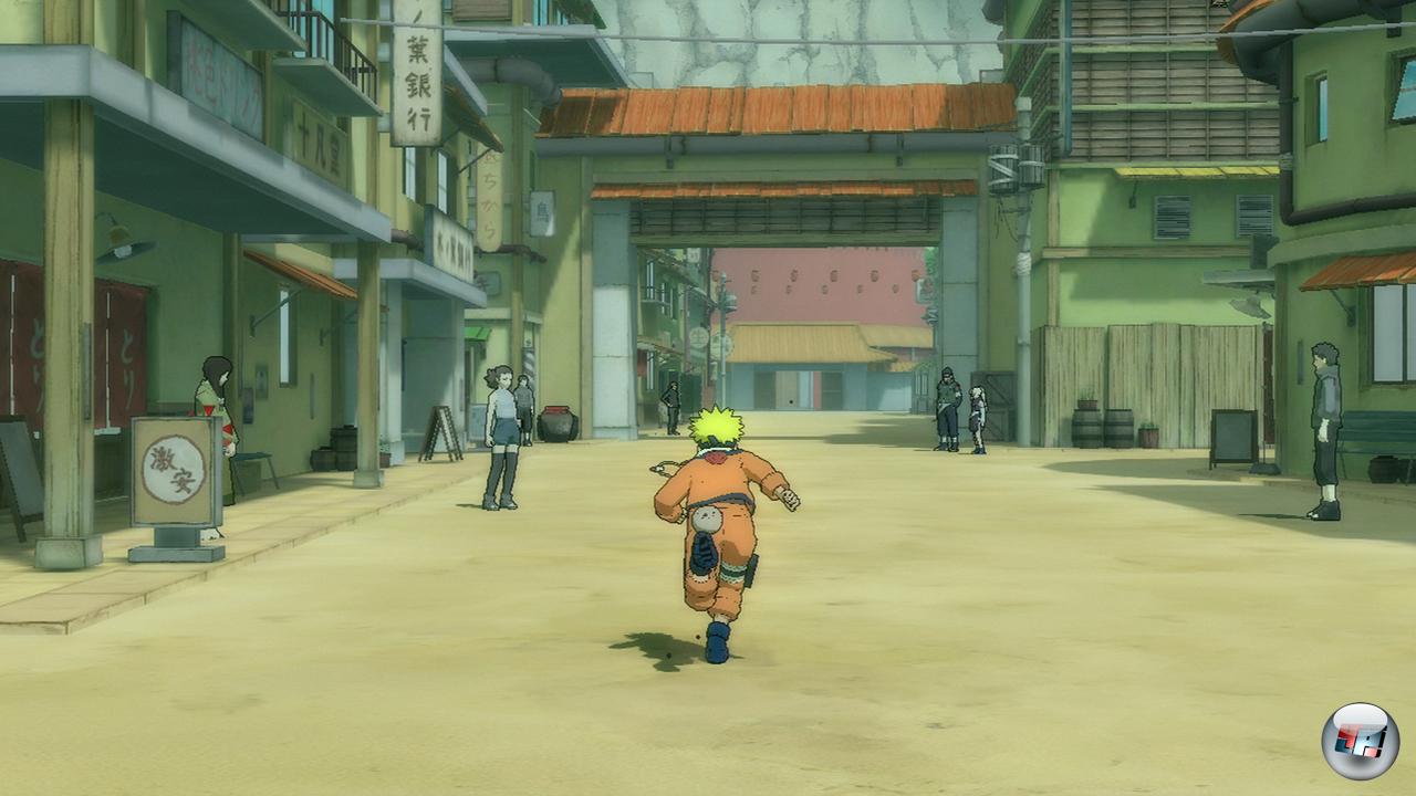 Trotzdem wirkt das Dorf dank zahlreicher individuell animierter Passanten recht lebendig, etwas mehr Interaktionsmöglichkeiten wären allerdings wünschenswert gewesen. Immerhin könnt ihr euch im Freien nahezu uneingeschränkt bewegen, selbst die höchsten Häuser erklimmen, Wände empor laufen, an Seilen turnen, euch per Naruto-Kanone von Dach zu Dach katapultieren,