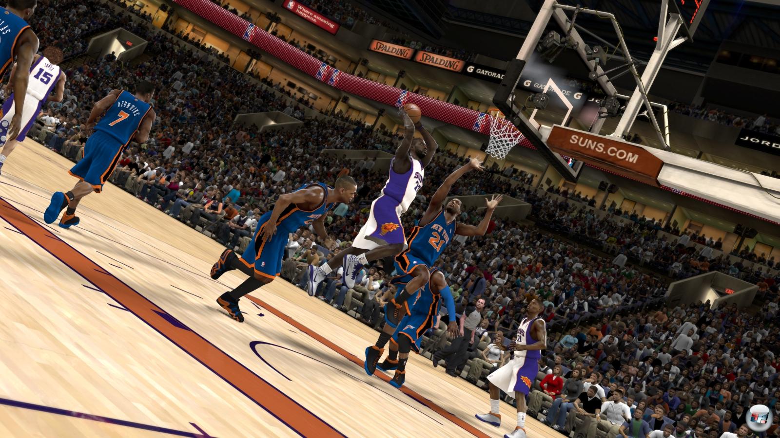 Kommt man trotzdem zum Schuss, bedeutet das zudem noch lange keine Punkte. Ein bedrängter Spieler hat es nämlich vergleichsweise schwer, ins Netz zu treffen. Erschreckend zuverlässig führen hingegen Pass-Korbleger-Kombinationen zum Ziel. Warum erschreckend? Weil NBA 2K11 auf einen sehr mächtigen Automatismus zurückgreift, wenn ein nur halbwegs sinnvoller Pass beim Mitspieler ankommt. Mit sinnvoll sind dabei Pässe in den Lauf des Partners gemeint, wobei auch weniger gut getimte Abspiele zum erfolgreichen Abschluss führen – ein Druck auf die Schusstaste direkt nach dem Pass reicht ja schon aus. Schade, denn so fehlt das Gefühl, eigenhändig Punkte zu erzielen. Nur bei Würfen aus der mittleren oder weiten Distanz kommt es noch aufs Timing beim Schießen an. Gut, dass die Mitspieler schon vor einem Pass eigenständig hinter der Dreierlinie in Stellung gehen. Ohnehin bringen sich die Kollegen stets clever in Position.