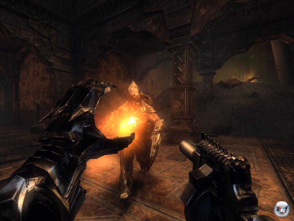 Nach den Scharmützeln mit den deutschen Soldaten und einiger mäßig interessanter, aber immerhin vorhandener Story-Zwischensequenzen der Marke B-Movie-Deluxe (die zwischen den Missionen u.a. durch vertonte Briefe fortgeführt werden), halten immer mehr höllisch/fantastische Elemente Einzug. Fortan sind Zombies unterwegs, die noch deutsche Wortfetzen stöhnen, Phantome oder Drachen fliegen durch die Gegend, blutrote Hunde huschen umher und bizarre Kreaturen mit einer Vorliebe für Stacheldraht machen ihre Oberflächenvisite. Ich verlasse zunehmend die Schützengräben und gelange in düstere Höhlensysteme oder sonstige kreative Vampir- oder Tempelanlagen, bevor es tief in die Unterwelt geht.